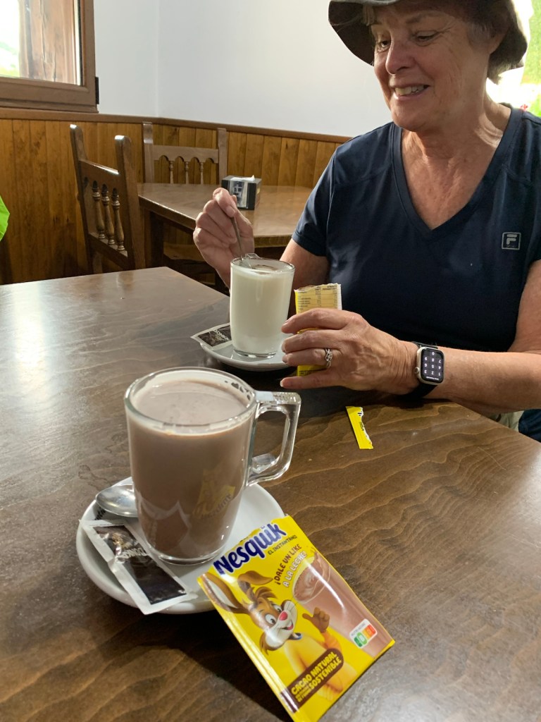 downhill walk into Ligondebreakfast #2 (hot chocolate) just before Ligondecute house in Ligondefirst time pilgrims taking the path (injury-getting-ready-to-happen wash) to the left, seasoned pilgrim ( Linda) taking pavement alternative to the rightLinda having breakfast #3 OJ at a bar less than .5 mile to Lestedo…. French lady walked by shortly after photo taken