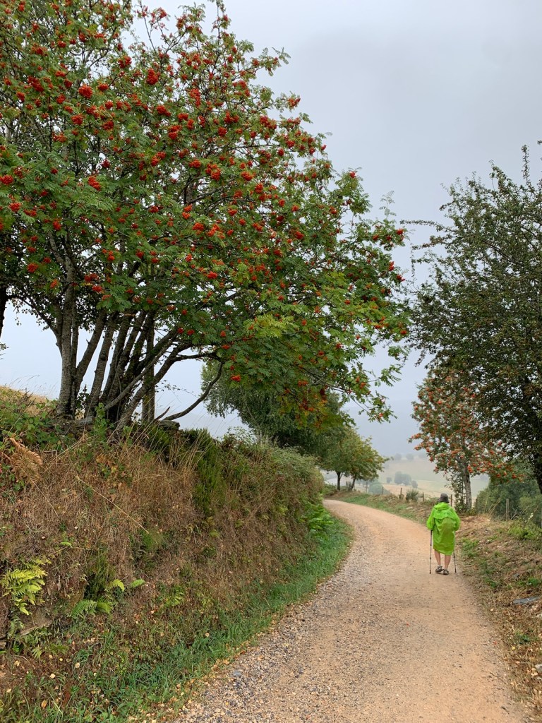 On our way out of Fillobal, Jim sleepily wished this pilgrim a buen Camino… who merely responded “ugh”even with our 7:15 start, it was not very light with the low hanging clouds and the deeply worn/eroded and tree lined path.awesome views abound, even as we near the bottom of a 2000 foot descent begun yesterday morning from the Galícian mountains.the path was lined with very old chestnut, oak, and pecan trees, some still thriving and bearing fruit even with exposed root systems.