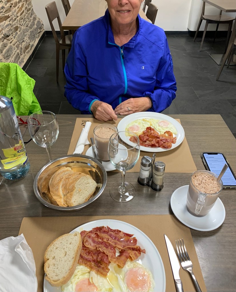 We stopped for breakfast #1 at Casa Molar, an albergue/bar in the tiny hamlet of Ventas de Narón. We have stopped here each of our 5 Caminos, especially for the toast which Linda ranks among the best.