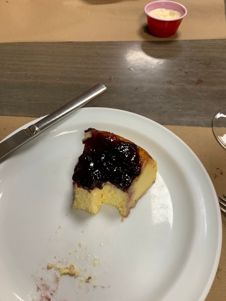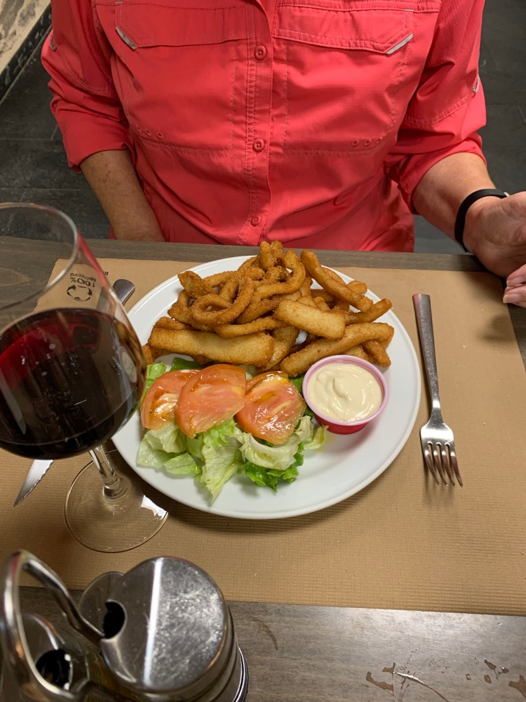 Excellent gazpacho and a mencia blend suggested by Rosa and enjoyed throughout the meal including dessertensalada mixta for JimCalamari for Lindaexcellent sample size as requested of a delicious rice pudding for LindaJim had already attacked this delicious blueberry cheesecake, then remembered to snap a photo