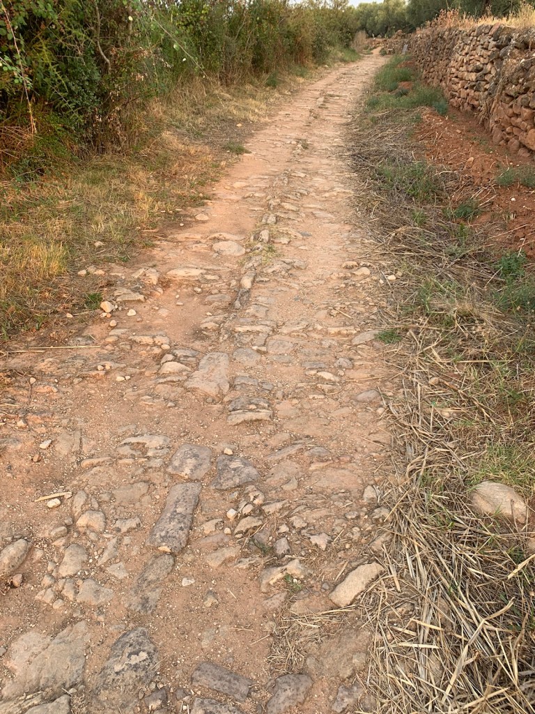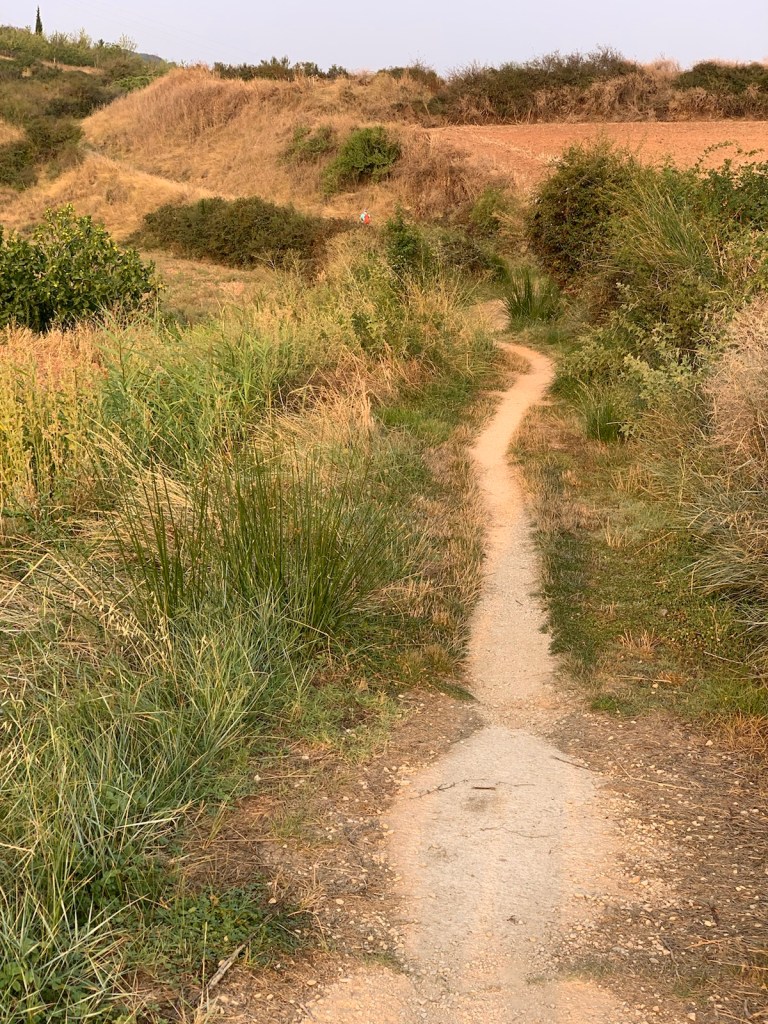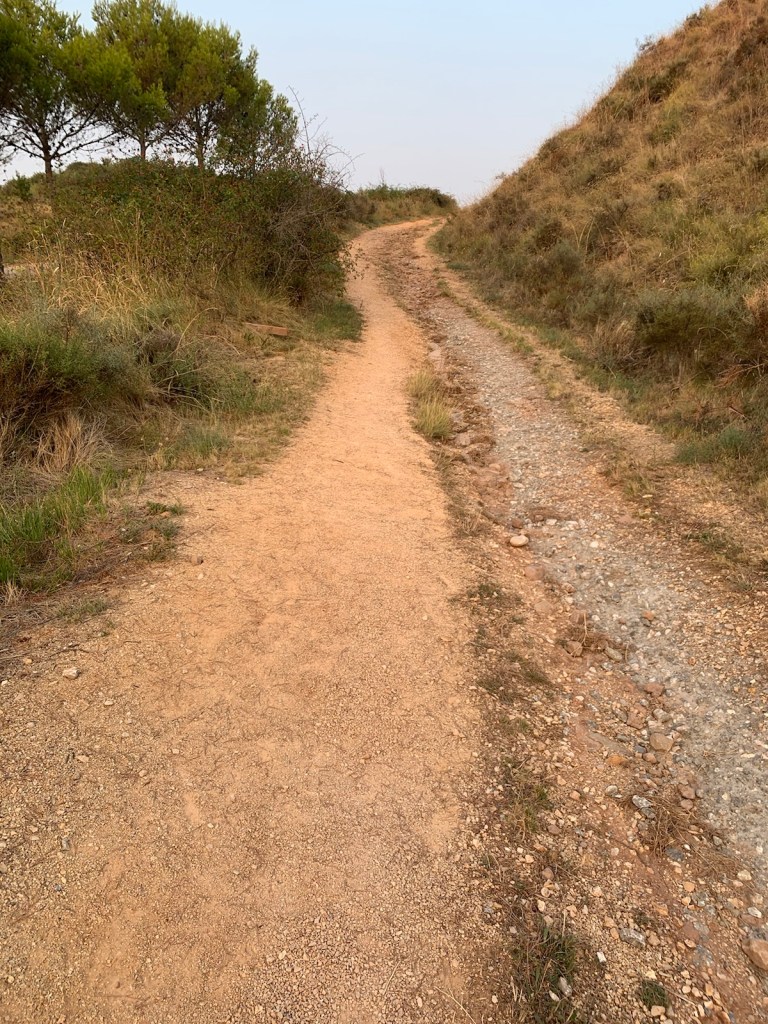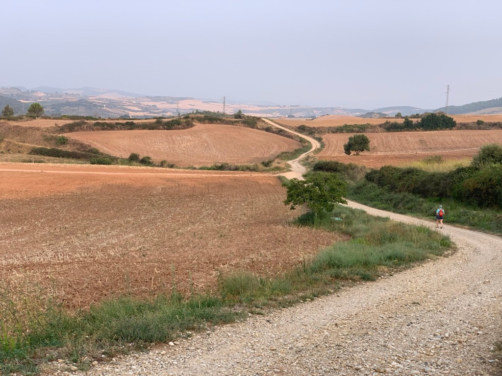 walking on farm road with camino path on right