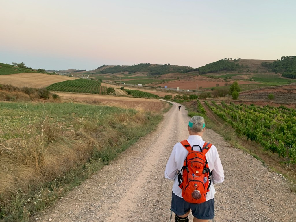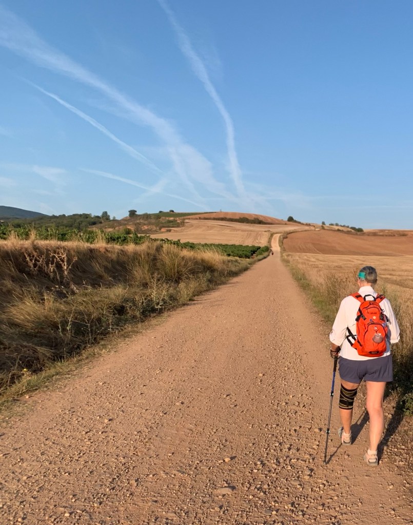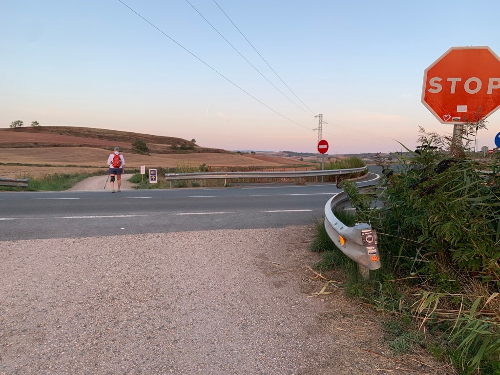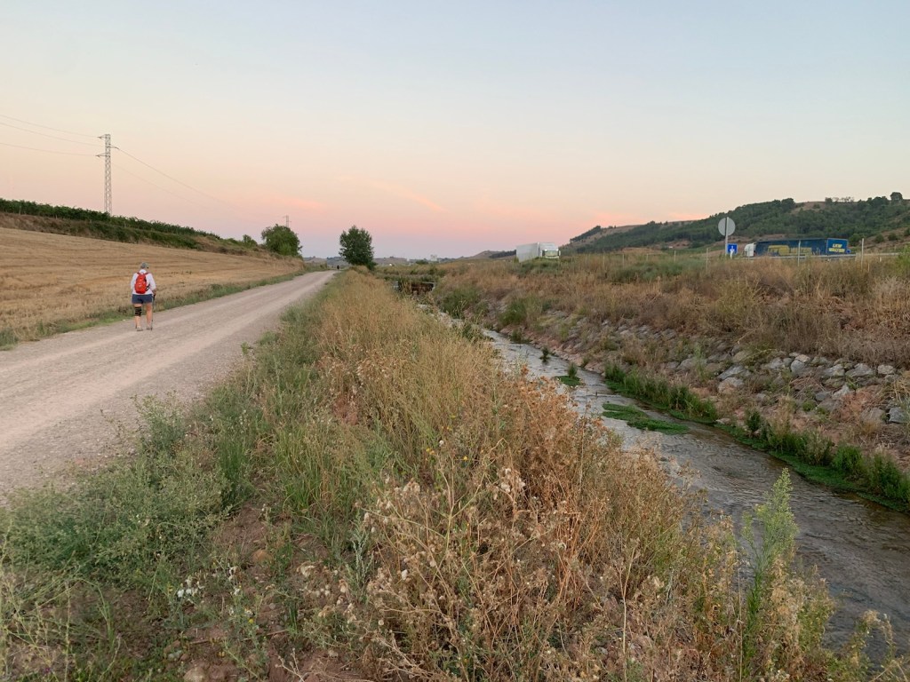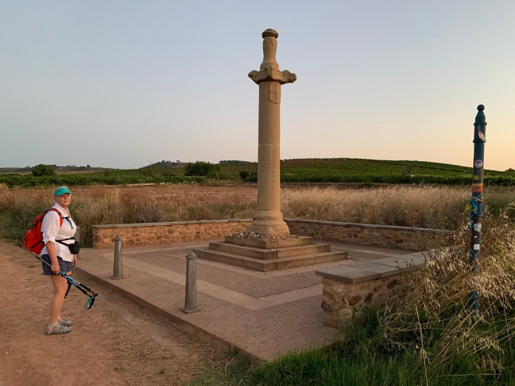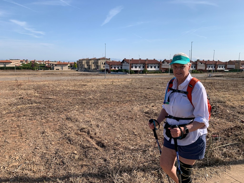 …just outside of Azofra, a medieval boundary marker.Typical scenery for the first two miles.grain fields to the left, major highway on the right… irrigation stream in betweenwaterfall and full stream, unusual for end of summer and dry weatheroops… forgot to stopwalking deeper into fields and vineyards away from the highway… red tint is from sunrise behind usafter 3 miles of this look, approaching long incline up to our destination for the daya pause on the way up the steep grade at the endLinda catching her breath at the top of this steep climbWalking into Cirueña, with the huge housing complex of Ciriñuela, associated with the Rioja Alta Golf Club in background.