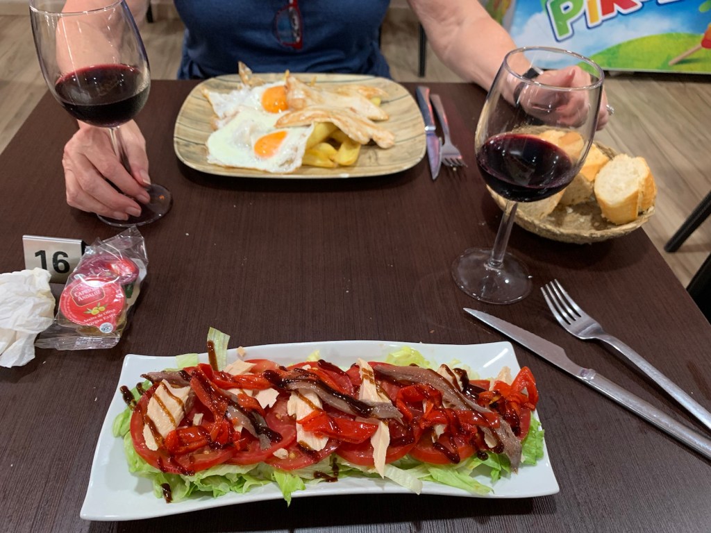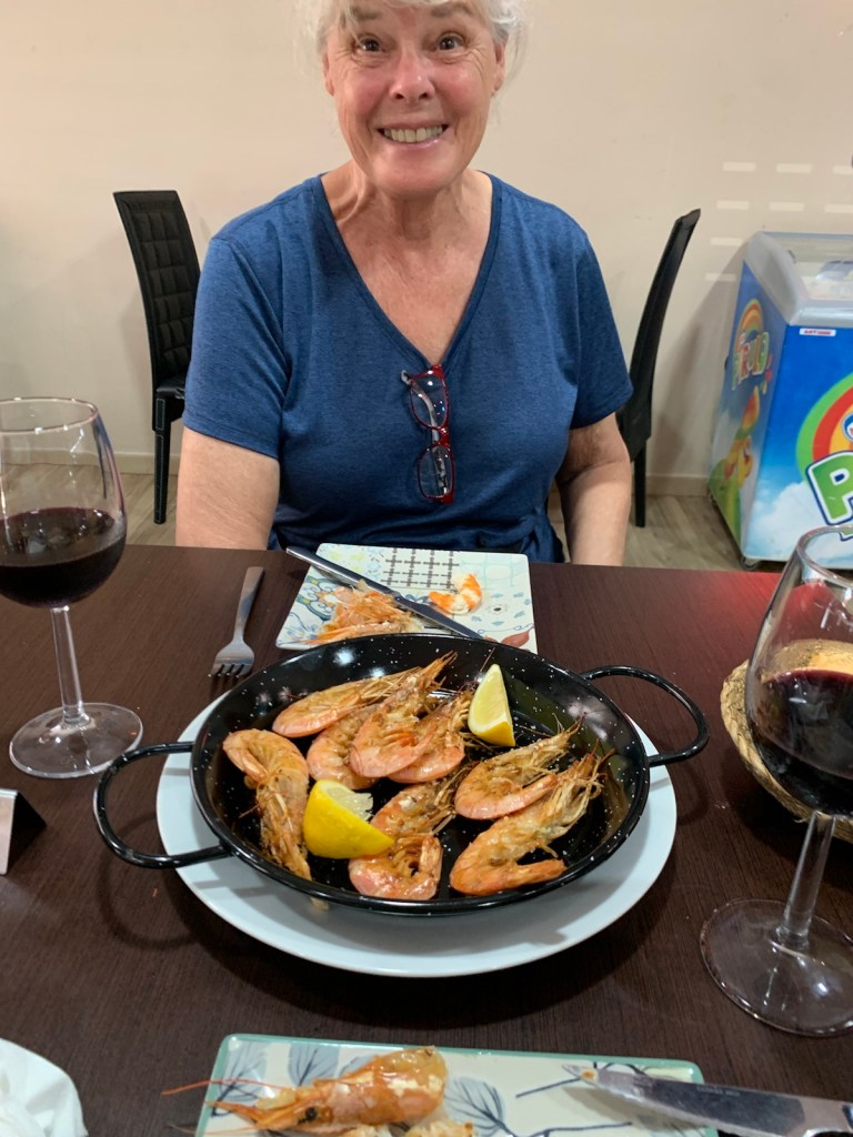 Lunch/Dinner: Langoustines for appetizerLunch/Dinner: Chicken breast, eggs, fries, for Linda….Mixed Salad (lettuce, roasted peppers, tomatoes,tuna and anchovies) for Jim