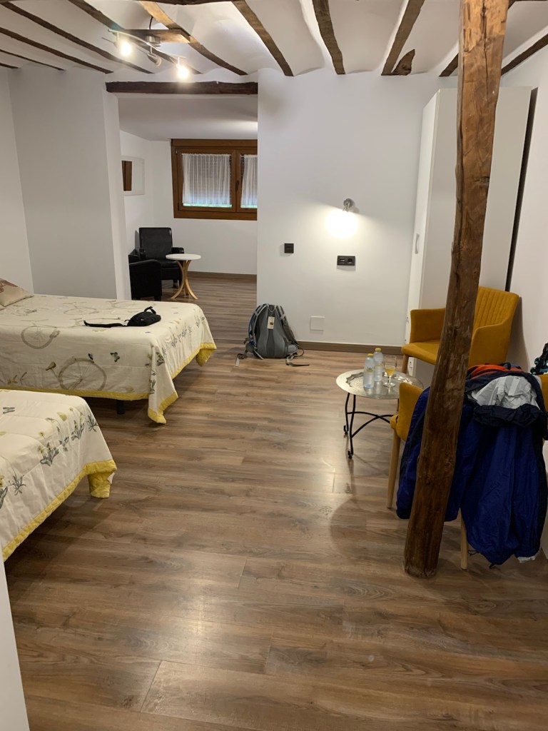 We followed our routine this afternoon with one additional highlight. Our grandson, Collin Shick, is playing in a professional pickleball tourney in Las Vegas this weekend. Jim became aware of this via a text from Collin’s dad yesterday. The smart TV in our hostal room had YouTube access so we watched Collin and partner Jack Sock win their Round of 64 and 32 matches in the comfort of our especially nice room, doing the Camino “our way”!