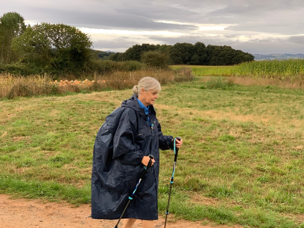 The rain started again after a half hour into the walk and rain gear came out.A relatively new stop that offers only light snacks and restrooms at our halfway point.a pumpkin patch and healthy looking gardenPilgrims were out in force this morning.Pilgrims, pilgrims, pilgrims