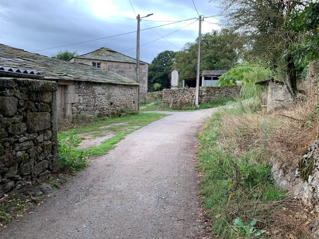 Pretty sky as we left O CotoThe. square and monument in our first hamlet walkthrough, Leboreiro.Iglesia de Santa Mariaa medieval bridge in DisicaboTypical path for a couple of miles behind commercial/industrial buildings outside of Melide… more of the same.a short section through a wooded area just before the hamlet of FurelosWe crossed over this medieval bridge to Furelos
