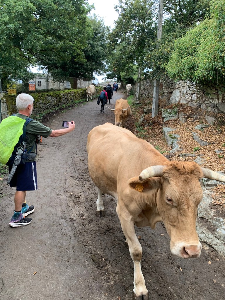 For a change, we had breakfast in Arzúa before walking.Most of the scenery today was in the forestsPilgrims were out in large numberswalking among the rootsSome farmland among the treesThe Camino is busier today than the autostradaThese cattle were changing pastures and were well under control….… for a good reason. She also had help from two well trained canine cowherds.A very large hórreo with larger steps for accessWe made a rest and OJ stop at this unusual bar/albergue. The hórreo spans across the Camino path.
