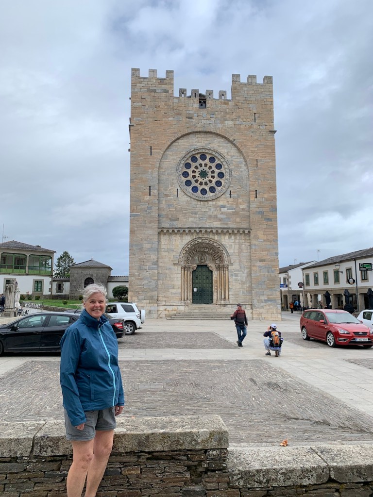 Linda in the main square of Portomarin with the Iglesia de San Nicolas in the background.