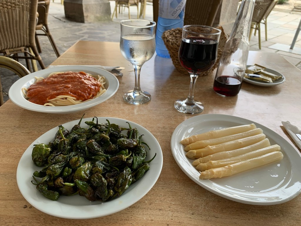 Linda ordered spaghetti and Jim ordered white asparagus and Padron pappers.the Padróns never had a chance!!’Our stop for lunch was loaded with pilgrims.