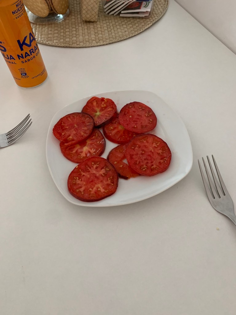 Because we had a kitchen in the apartment, we sliced the tomatoes we were gifted in Pintin and had carried, carefully without bruising for two days and had a late afternoon snack, Yum!