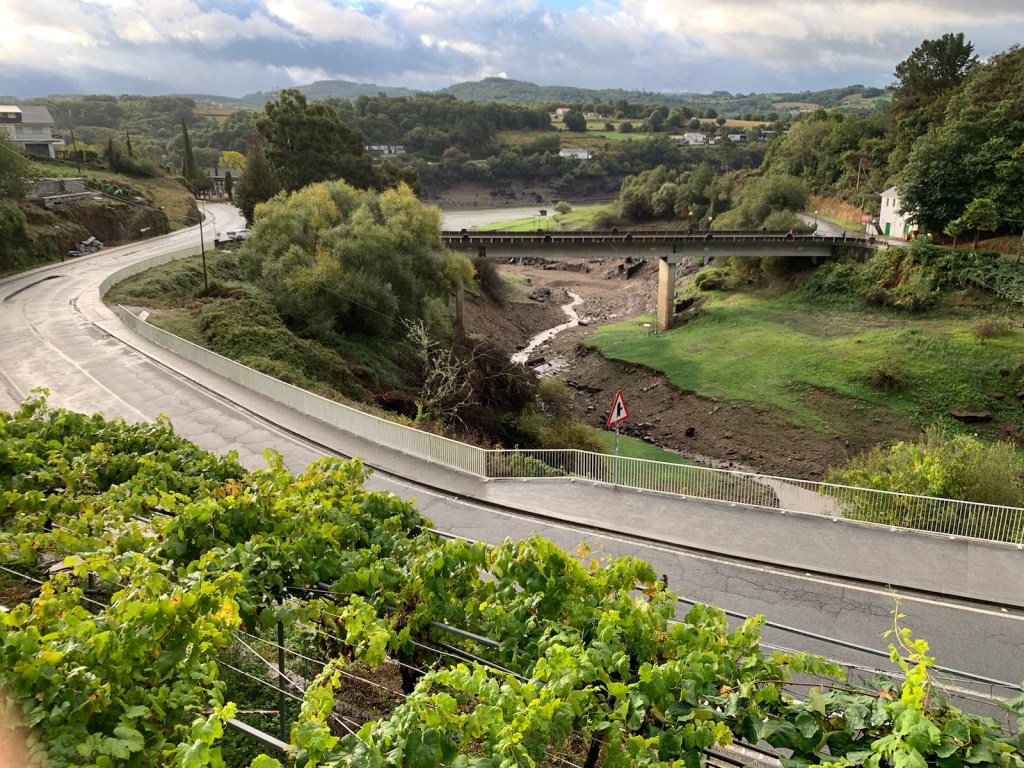 Breakfast at Bar Gonzar in PortomarinThe view of the reservoir covering old Portomarin from Bar GonzarTwo showers occurred and then stopped while we had breakfast. When all was clear, we began walking down from Portomarín to cross the bridge going out of town.We walked along the river below us, then across the bridge then began the long climb up the Camino path.near center photo you can see a line of pilgrims walking toward the multi-storied house and up the mountain