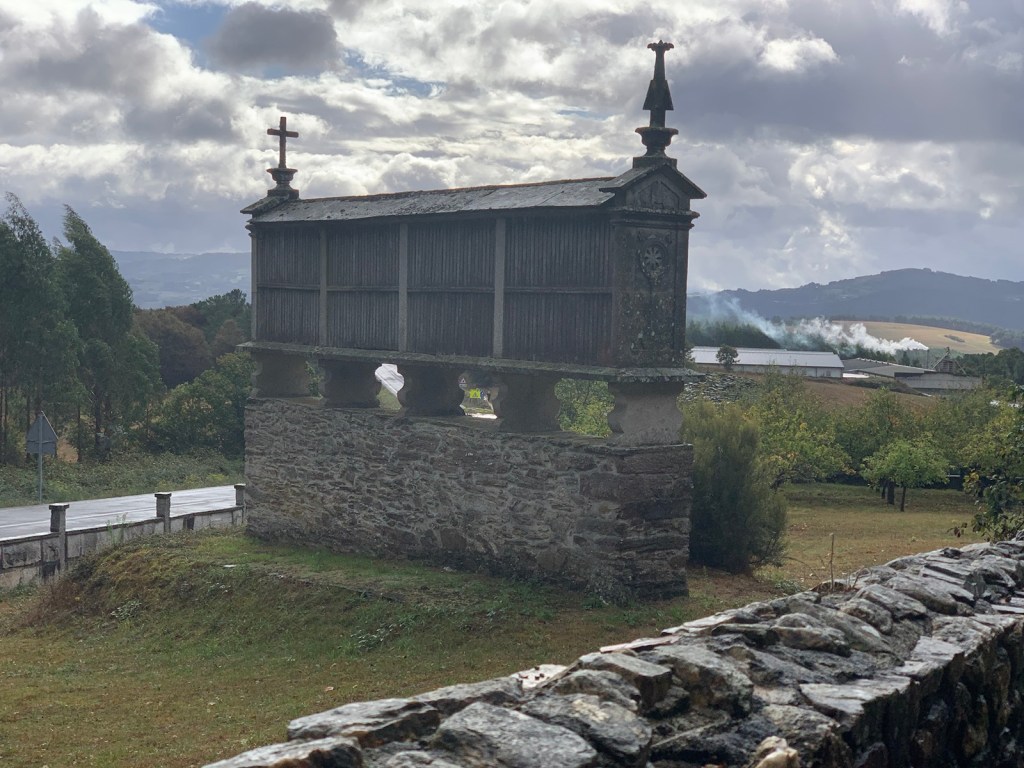 A colorful fall garden along the road as we left Gonzar this morning. The Camino went left to zigzag through the countryside ultimately rejoining the road in about 3 miles. We took the road to dovetail with the Camino path in 2 miles.The road was not very busy and we watched for vehicles and they were watching for us, which was reasonably safe and saved us a mile or more of extra walking through the mud, puddles and manure.The path and this local road merged just before Ventas de Narón where we stopped for breakfast.leaving Ventas de Narón