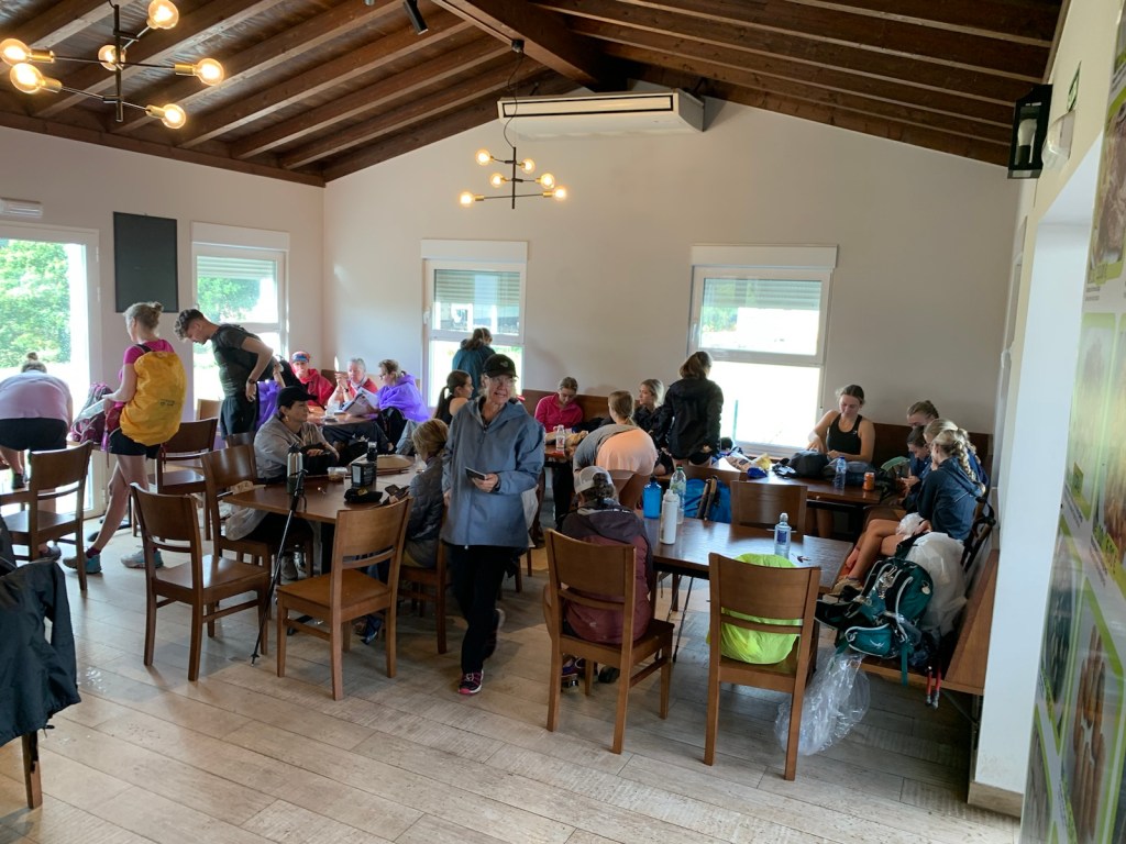 This was the long incline we took out of Portomarin.Amy’s trees ( Jim’s daughter did a painting of these trees which is hanging in Jim’s office among Camino memorabilia.)looking back at Amy’s trees from a “different perspective”The path paralleled the local, but busy highway much of the waya welcomed deviation from walking right next to the highway.a huge horreo in the yard of a resident in ToxibóA wet walk through this forrest giving us a break from the road.Pilgrims were out in large numbers todaypilgrims sometimes ride horsesThe final section of path along the highway has an actual railing to protect pilgrims, as we walked to our home for the afternoon and evening.A large contingent of pilgrims, mostly teens, had arrived ahead of us.the line to use the women’s toiletpilgrims gathering to get back to walkingtables starting to become available as the pilgrim group began to leavethe pilgrim hoards can be seen lining the highway as they vacated the restaurant of Hosteria de Gonzar.