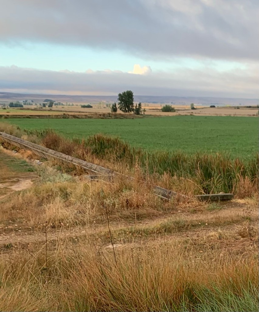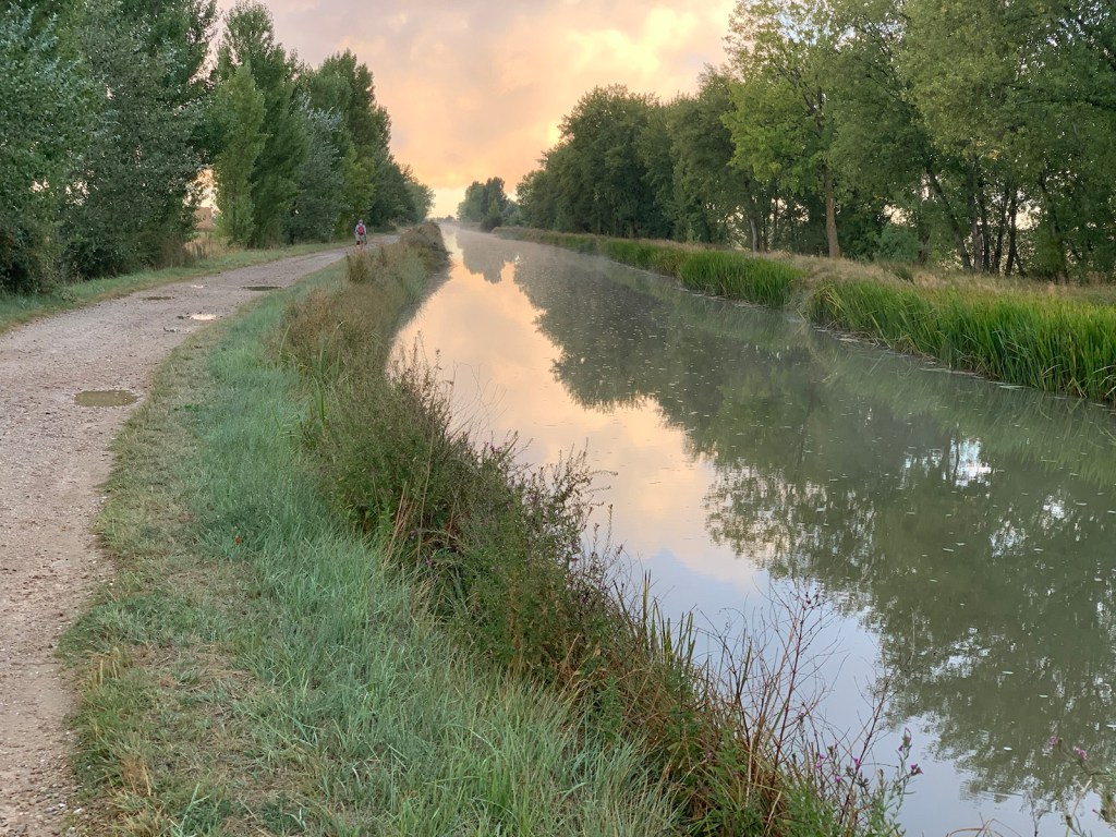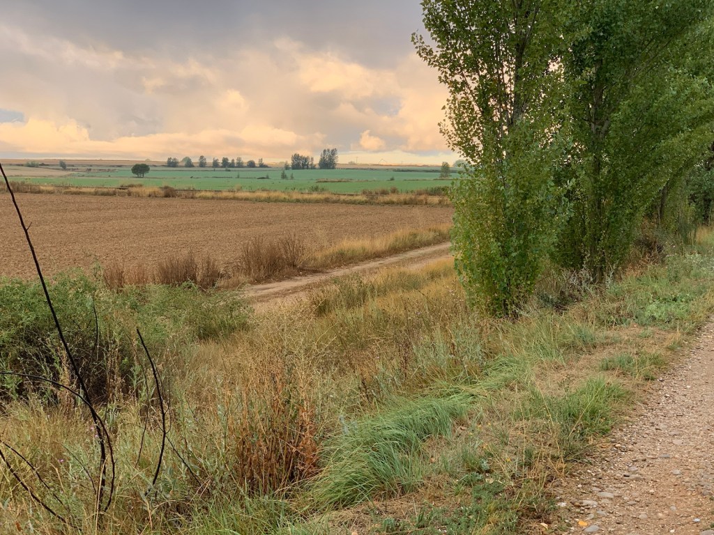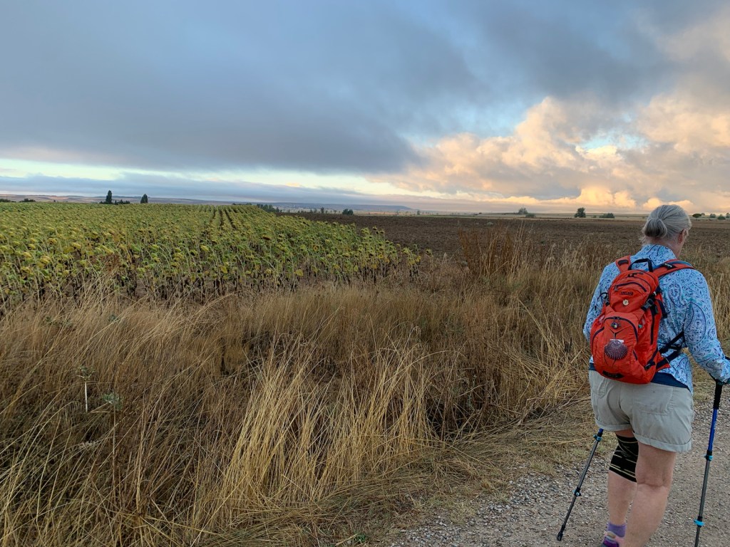 Leaving Boadilla behind cloudy sky aheadWe walked by the first of many sunflower fields …… and then a plowed field with only one (sunflower, that is).A short mile after Boadilla del Camino, we began walking along the Canal de Castilla.