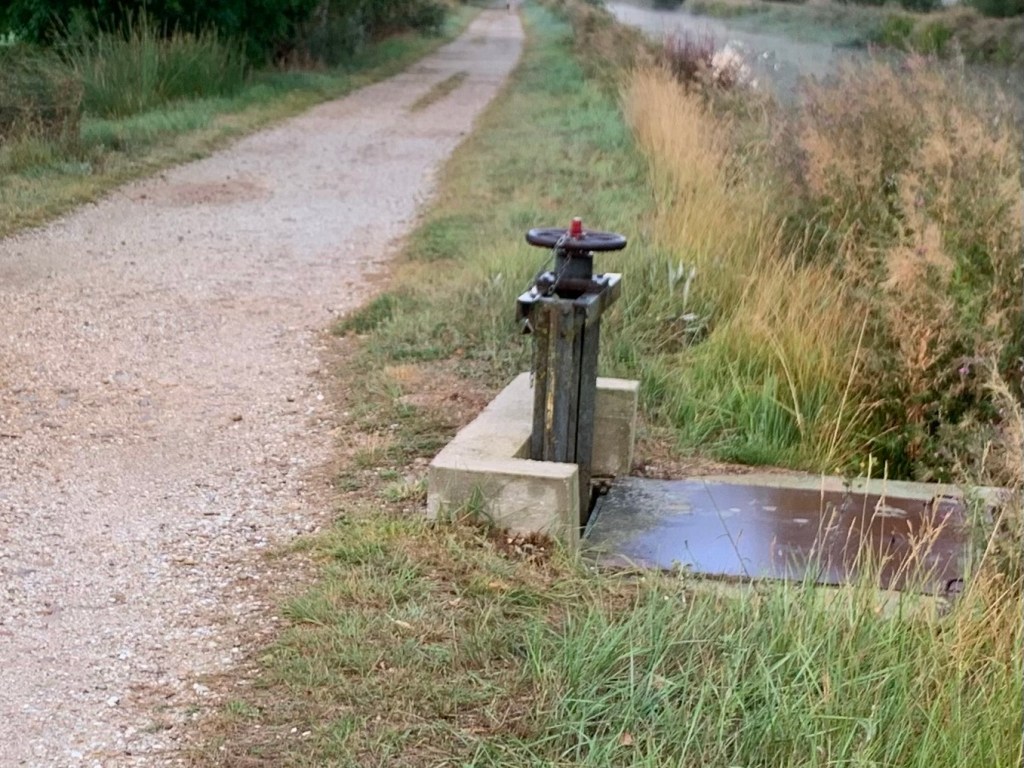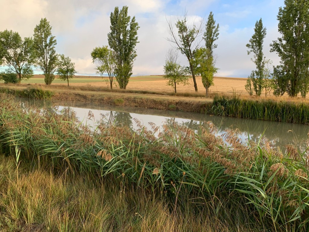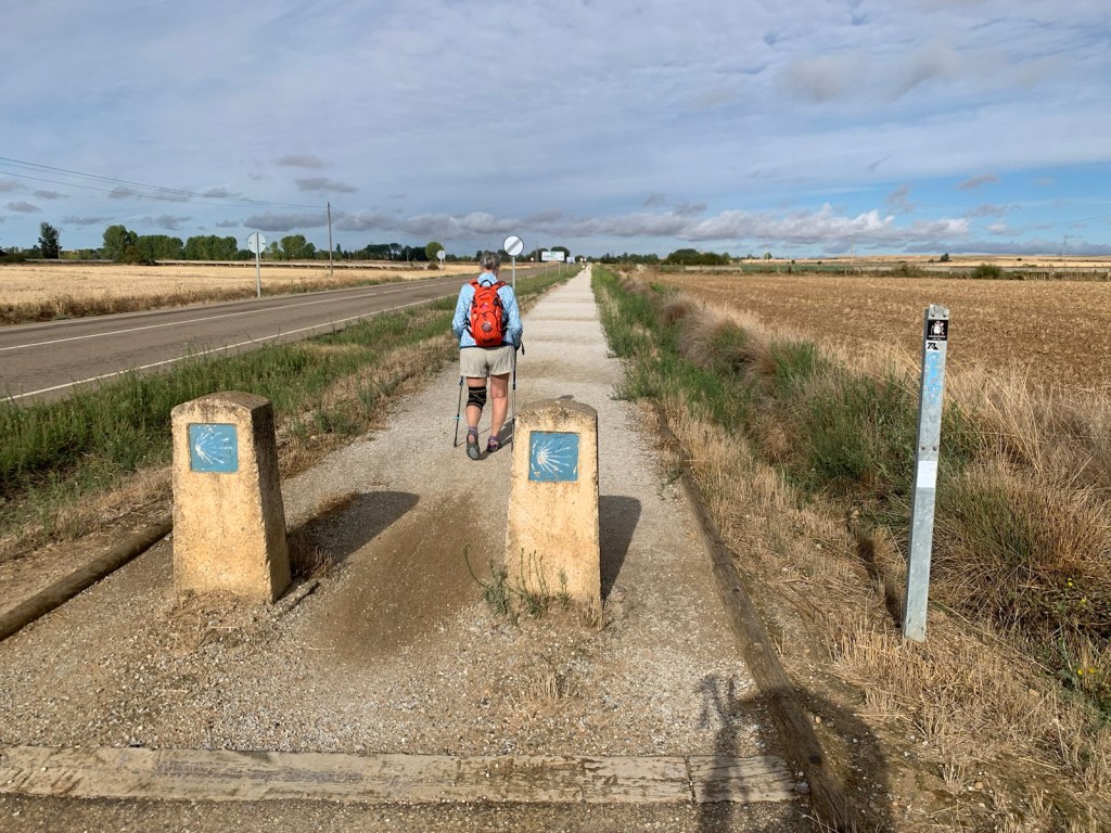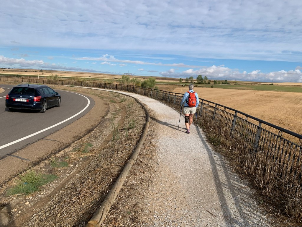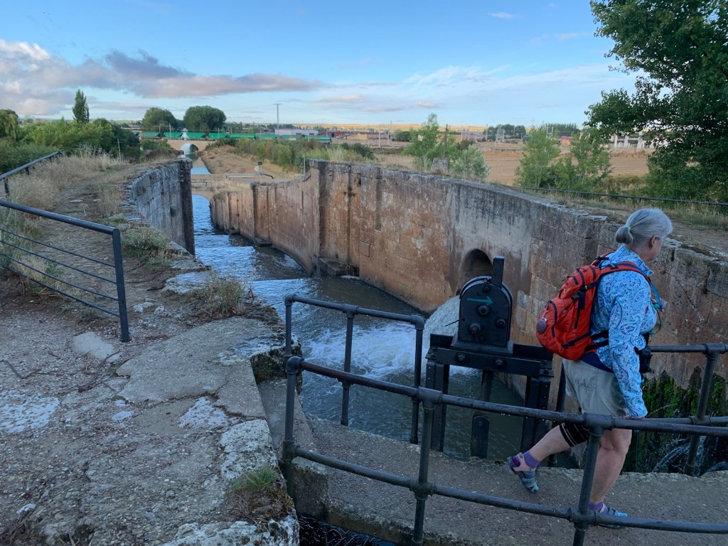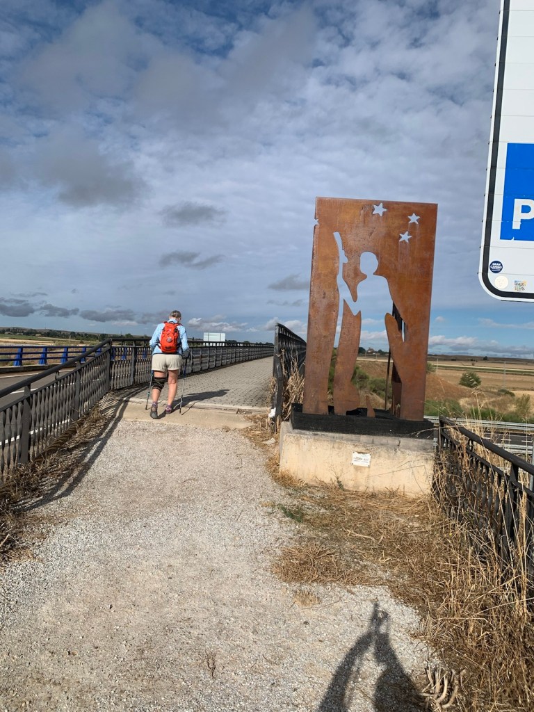 Fields to the left of us….Fields to the right of usOne of several valves observed along the canal…… to feed irrigation ducts and more modern irrigation systems allowing beautifully green fieldsthe Canal making a broad turnA tour boat that provides a 90 minute ride along the 2 miles between this morning’s starting point to the locks (in the background). Operates M-W, 12:30 and 18:30. (5€ round trip, 2€ for pilgrims)The locks, on the outskirts of FromistaLinda cautiously crossing the locksThe hazardous (for pilgrims) stretch of road going into Fromista.The pleasantly, picturesque path leading out of FromistaA familiar style of sculpture seen along the Camino path.This is one of the few, safe pathways for pilgrims to navigate through highway overpasses and turnabouts.Just after maneuvering through the autovia intersection, we rejoined the Camino gravel/dirt path. This section of path is mostly straight, along a relatively unbusy secondary road for nearly over 18 kms (12 miles).Heading into Población de CamposOur home for the rest of the day and tonight