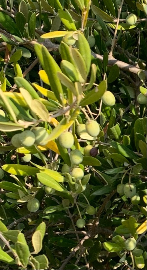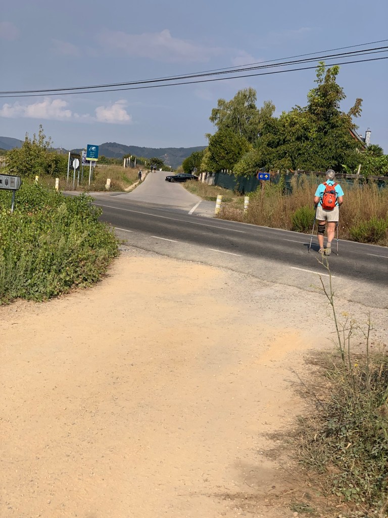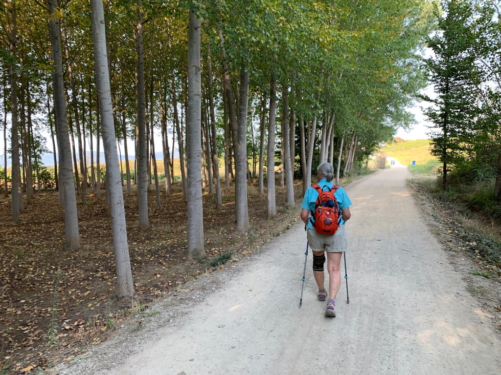 Today’s walk was just what we needed. The first half was on flat, mostly wide city sidewalks with plenty of places to stop for a break. The second half was back on the dirt path, through mostly vineyards and an occasional shady group of trees or gently, undemanding rolling hills.