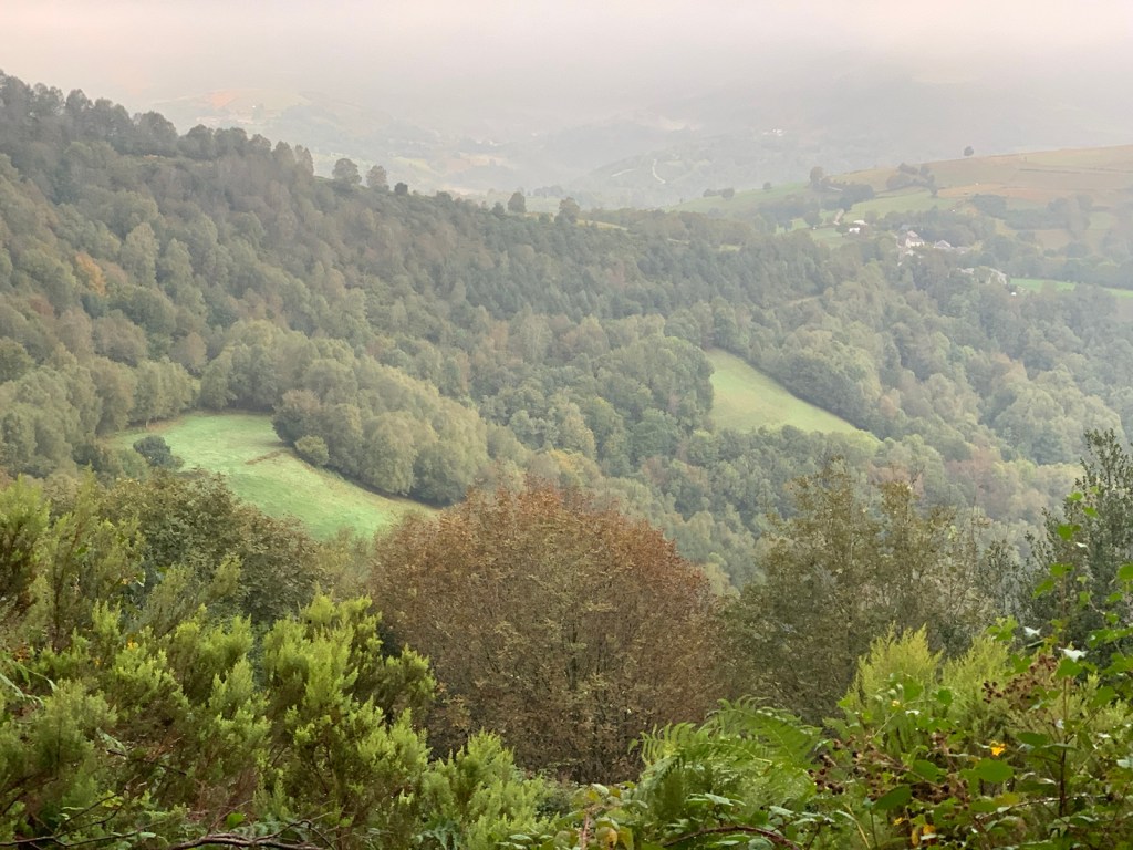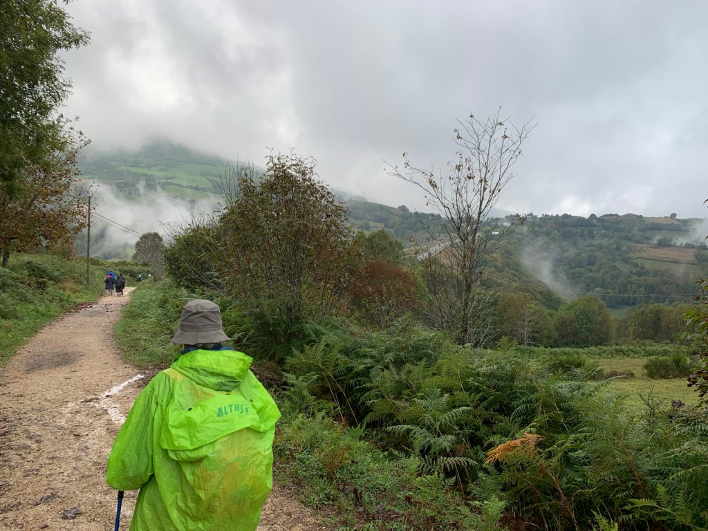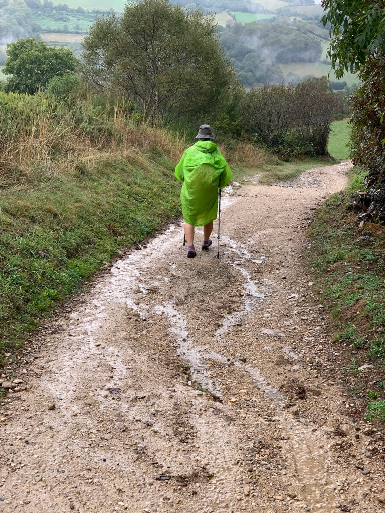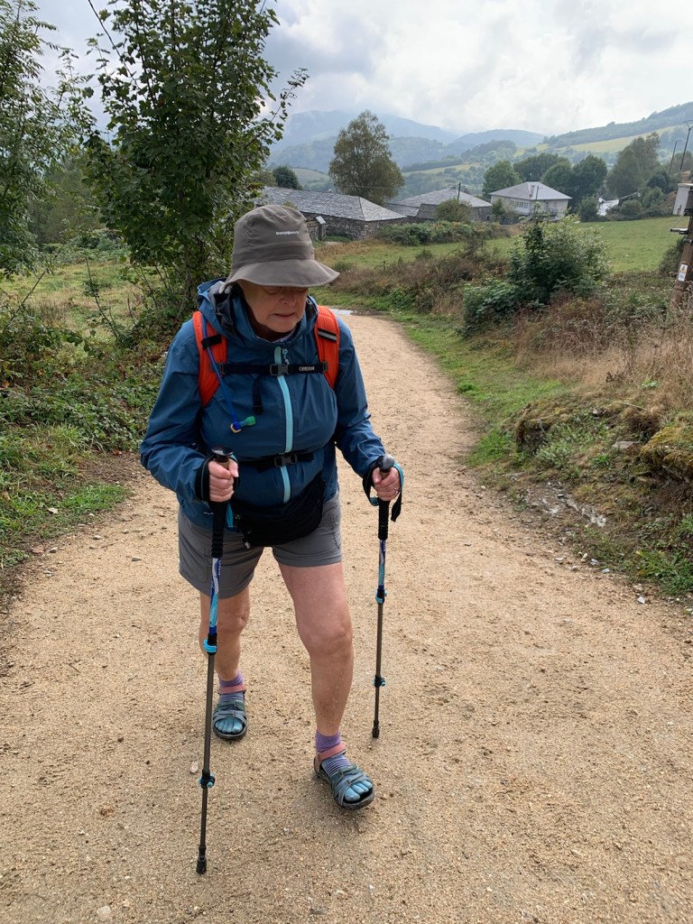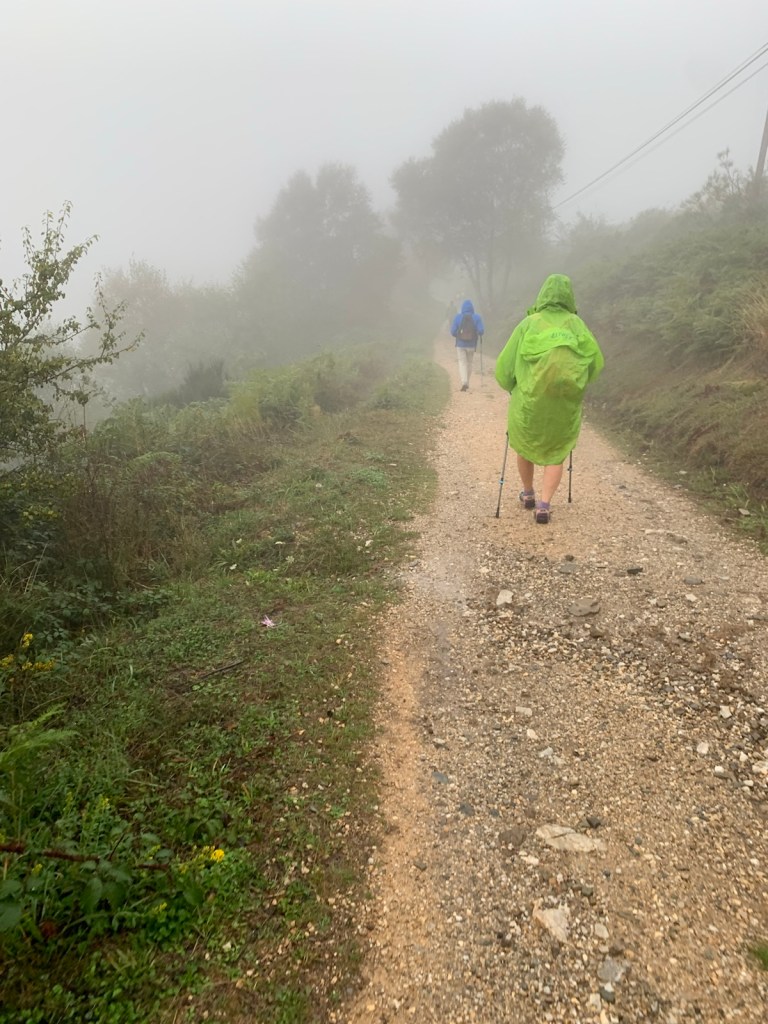 We stopped at the bar atop Poio for fresh squeezed OJ. We also had an interesting chat with two peregrinas from Montreal. This delay enabled us time to catch our breath and it gave the rain clouds long enough to re-position themselves, so we would need our rain gear again on the final 2-mile walk into Fonfria.