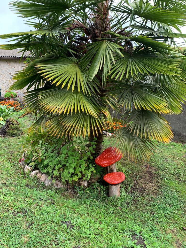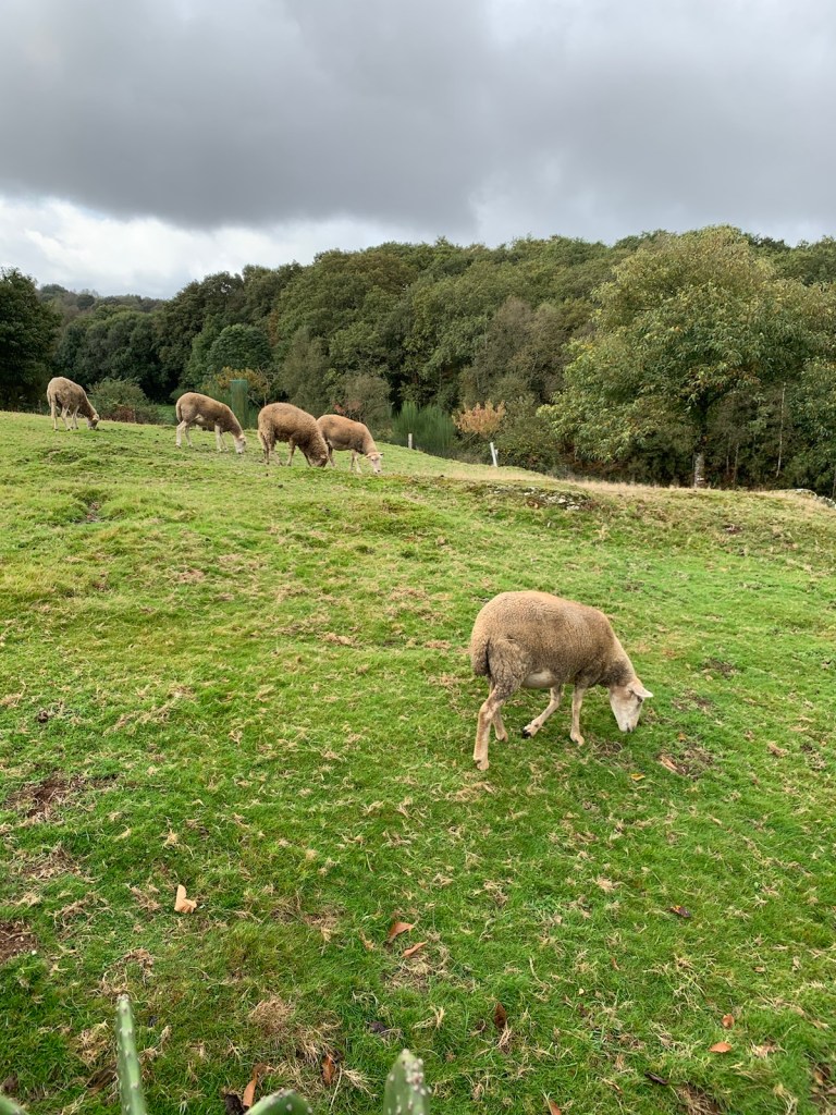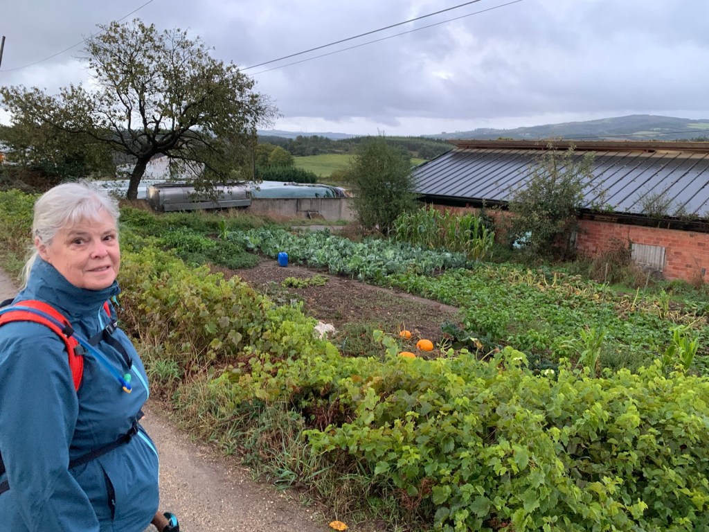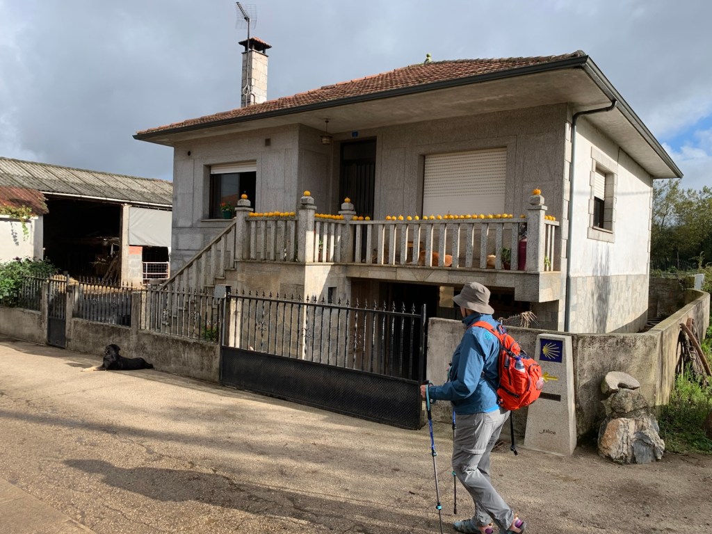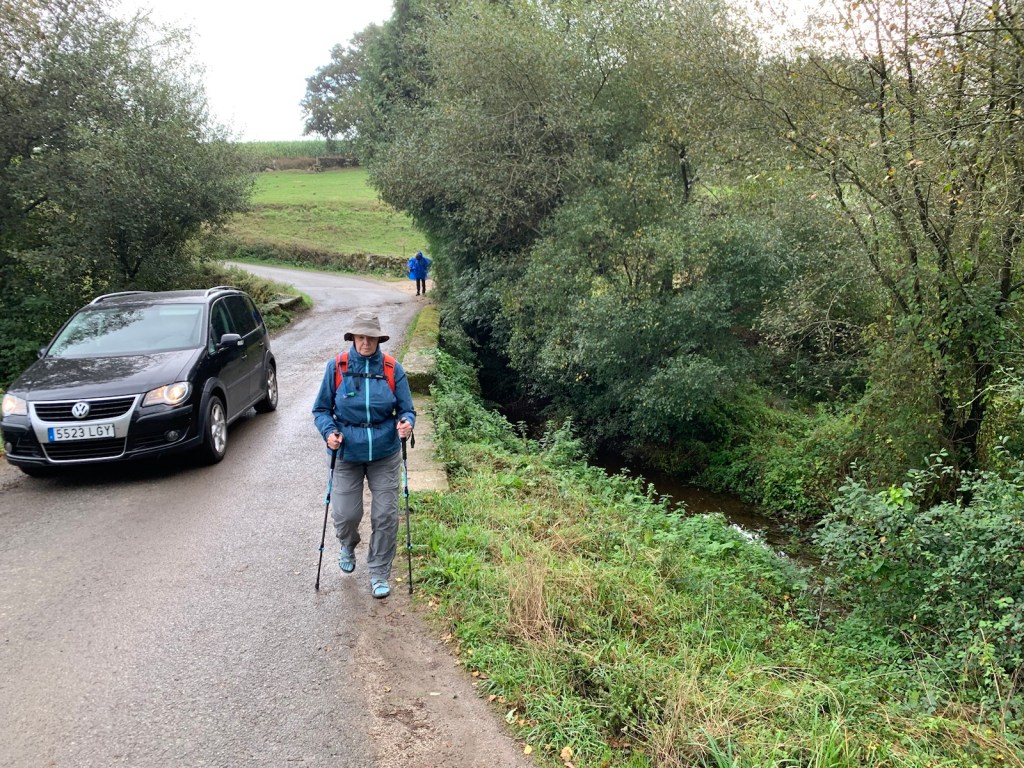 We were walking up the hill from Ligonde toward Exirexe ( pop. 23) when it began to rain heavily. As we were scrambling to get our ponchos on, a man waved from his open garage for us to come inside…which we did. We chatted as best we could with our limited Spanish and his limited English. We learned that he was in his late 70’s, he had retired from Correos, the national post office service, he had walked the Camino 7 times and they were getting an unusually amount of rain this year. It was a neat encounter and as the shower stopped, we snapped a photo and moved on.