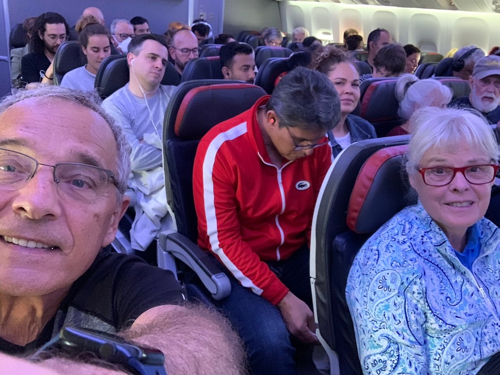 The Hotel Shuttle delivered us to the T-4 terminal at 8:45 where we checked our packs at the American Airlines reception area (no waiting in line), cleared security without incident and walked to our flight’s boarding area and waited until boarding at 11:40 a.m.