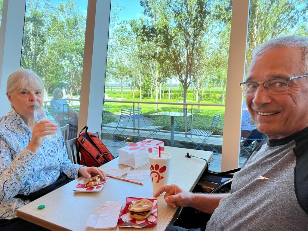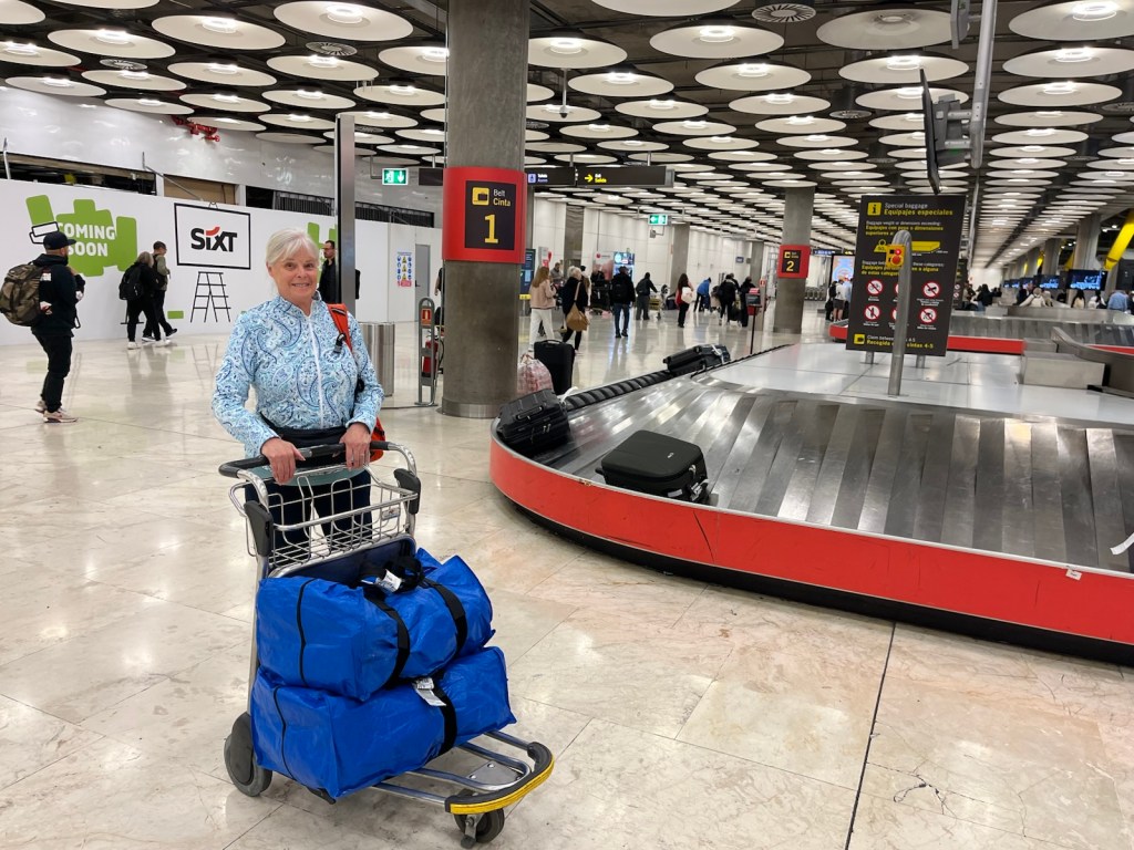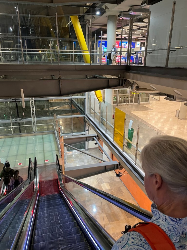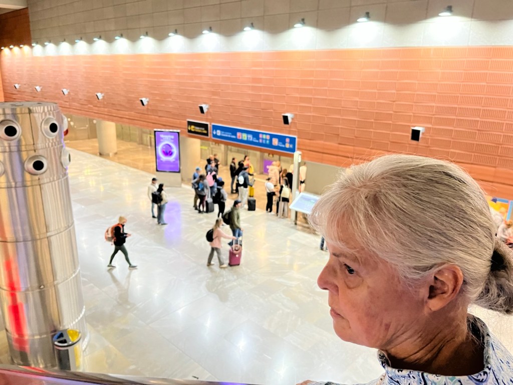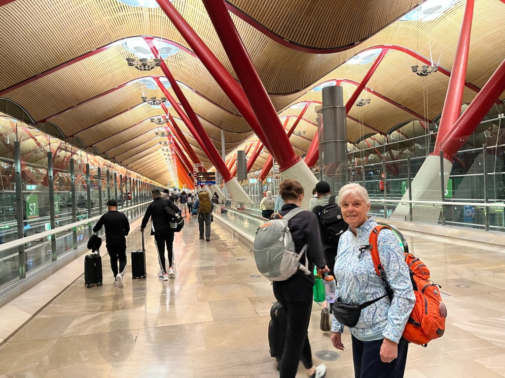 Chick-Fil-a brunch at GSP … waiting for our 12:59 flight.Waiting to board and happy after confirming our backpacks were loaded via the AA app.Also waiting to board our flight were two pilgrims (we spotted shells on their backpacks) from Chapel Hill, NC. This will be the first Camino for Jake and second for Ciara. They were going to start their Camino in St Jean Pied de Port (SJPDP).Waiting for takeoff in CLT. The eight hour flight began on schedule but was full and cramped. Sleep was at best, limited and fretful. The flight was otherwise smooth and uneventful.Arriving at MAD at 5:30 a.m., then taking in the incredible architecture and decor of our favorite airport as we walked to customs.After clearing customs, which was very efficient… taking only 15 minutes to handle a long queue… we took multiple escalators down to the airport subway level.The wait for the subway was only 4 minutes. And the ride to the main terminal was only 5 minutes.… we took more escalators from the subway level to the massive baggage recovery area…… where our backpacks were waiting for us. It’s always a relief to retrieve our backpacks!