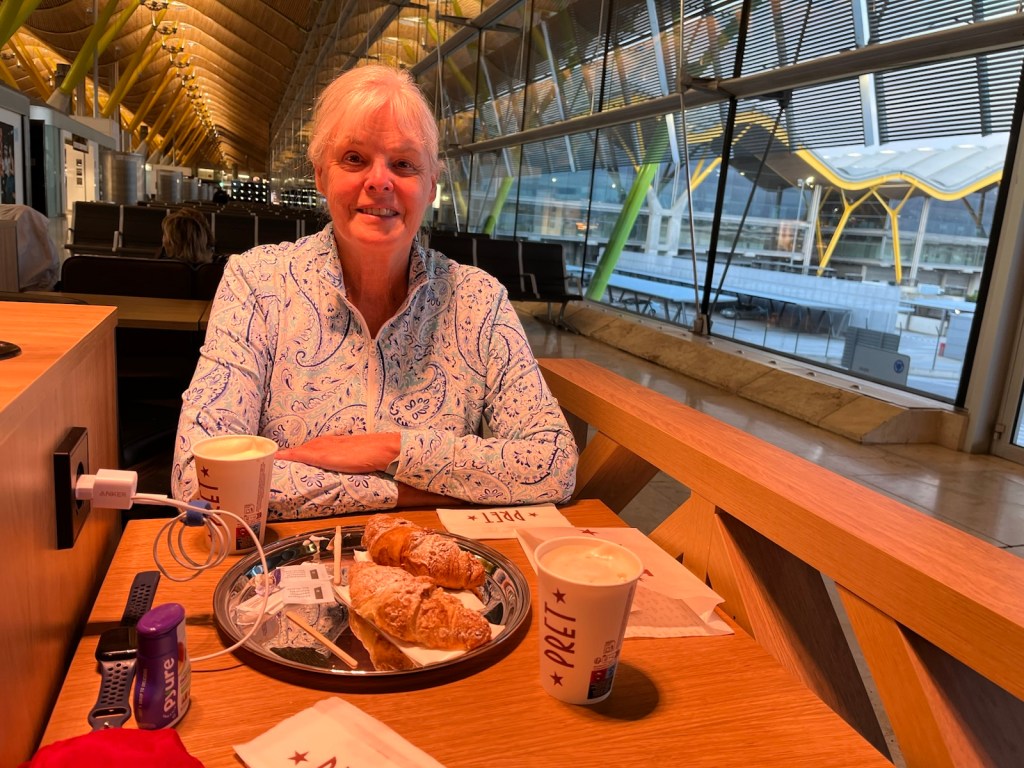 Next, we cleared through security without incident and got directions to an eatery near the gate for boarding the noon flight to Pamplona.