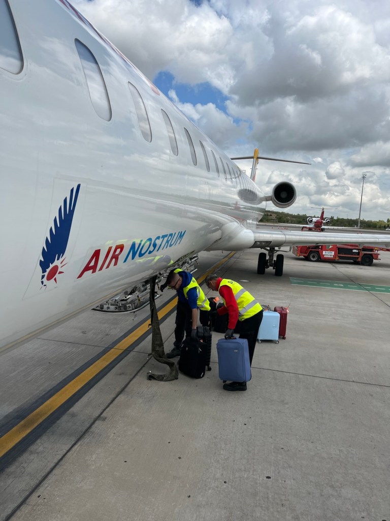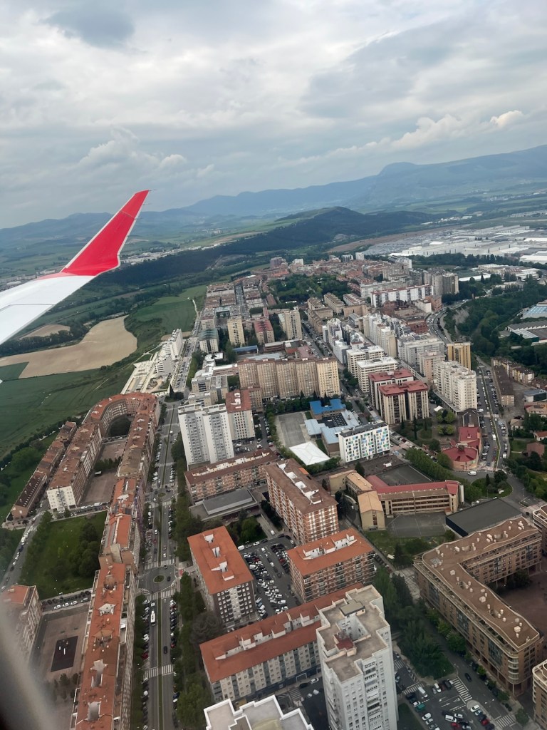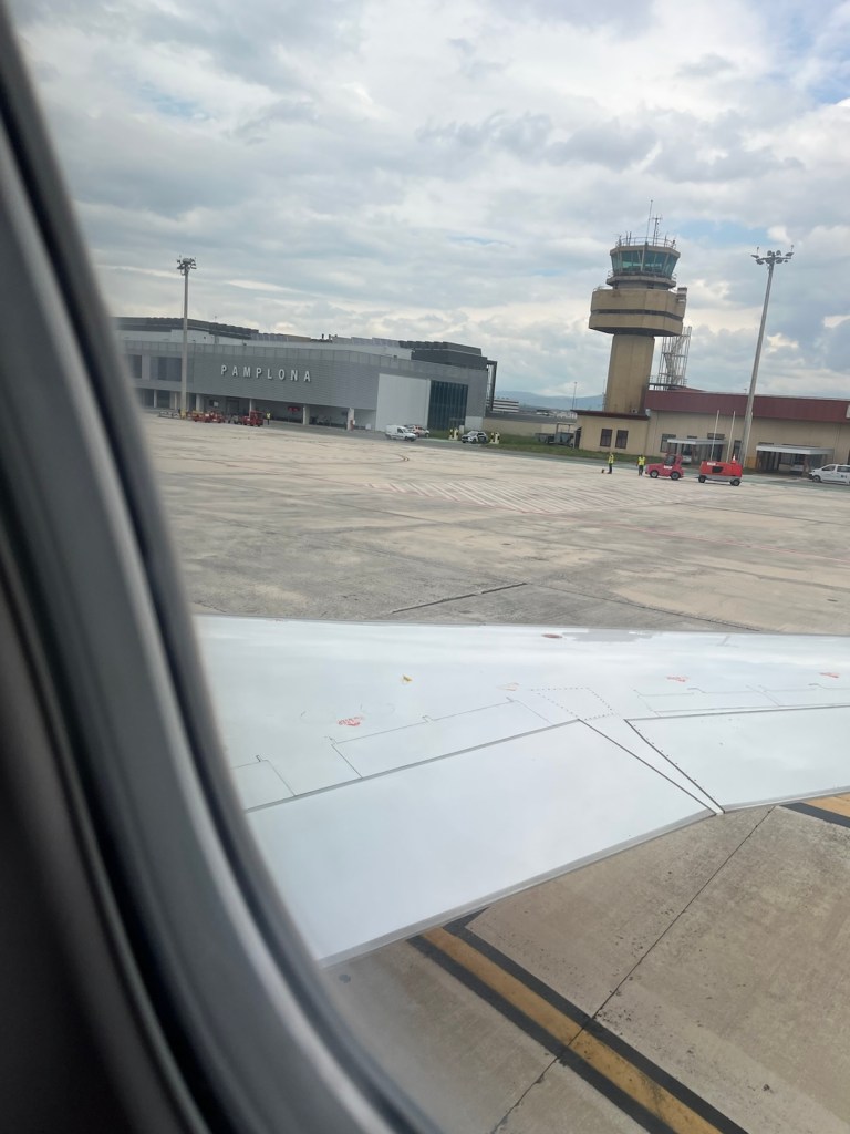 Beginning our wait for the fight to Pamplona and enjoying a breakfast of cafe con leche and an almond croissant.Our flight departed from MAD on time and touched down in Pamplona at 1:30 p.m. Part of Pamplona seen on our approach to the airport.The Pamplona airport is pretty small and basic from the outside…… and pretty basic inside, as well. Our checked backpacks were already waiting for us on the turnstile by the time we deplaned and walked about a 100 yards on the tarmac to inside.