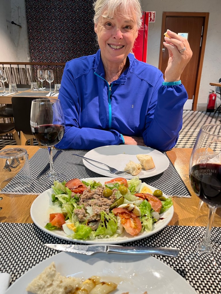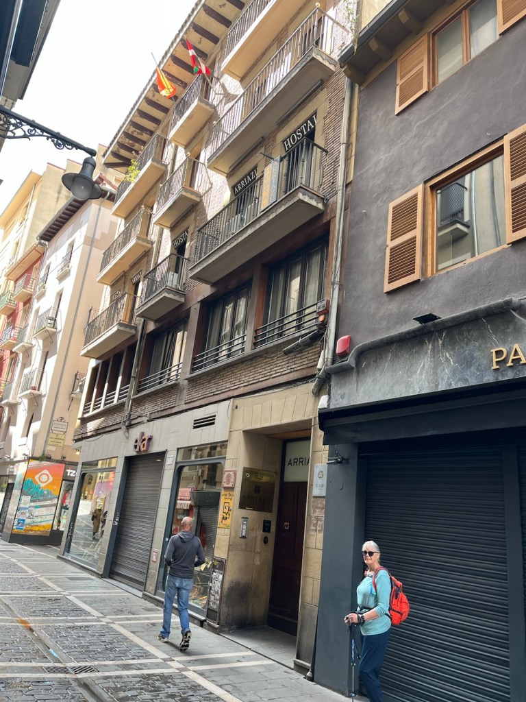 After lunch/dinner we played a game of hand-and-foot with dark chocolate dessert number #2, then retired to our room to rest and finalize preparations for a test walk on Sunday morning. The walk will be from old city Pamplona for a few miles west and return to validate our organization decisions before leaving Pamplona behind for Camino 2025 on Monday morning.