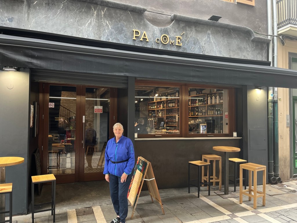 We walked to a favorite restaurant, Café Iruña, also a favorite of Ernest Hemingway, and had our Camino breakfast of café con leche & tostados around noon. Afterward, we did some minor shopping, then returned to our room to organize/repack our backpacks for transport and our day packs for walking.