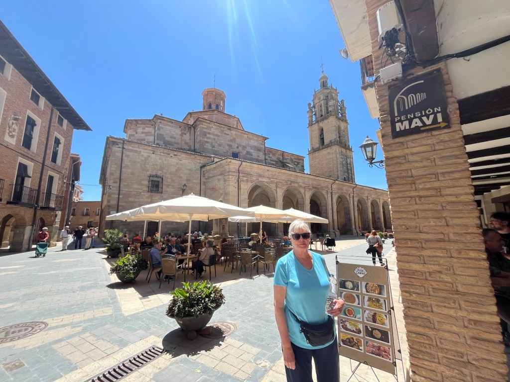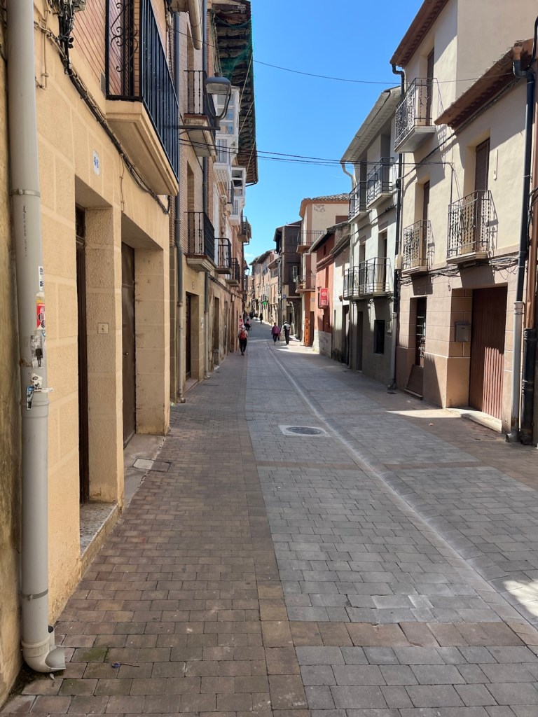 A brief bend in the path then straight again Long straight stretch here …… then once we reached the top, the path continued straight ahead.one of the few bends in the path broke the monotony, sort of.we took a sharp left at the Camino marker. then went straight againanother sharp right , then straight againanother straight section before meandering for a short while in the woods in the distance.a short walk on the edge of the woods……then a short walk across a creek and wetlands.back on the semi-.straight road again… before reaching the edge of Los Arcos.Typical street in old Los Arcos.Pensión MAVI, our home for the nightLos Arcos’s goes back to Roman times. The Iglesia de Santa María de la Asunción dominates the old town square and has one of the most ornate retablo’s on the Camino,