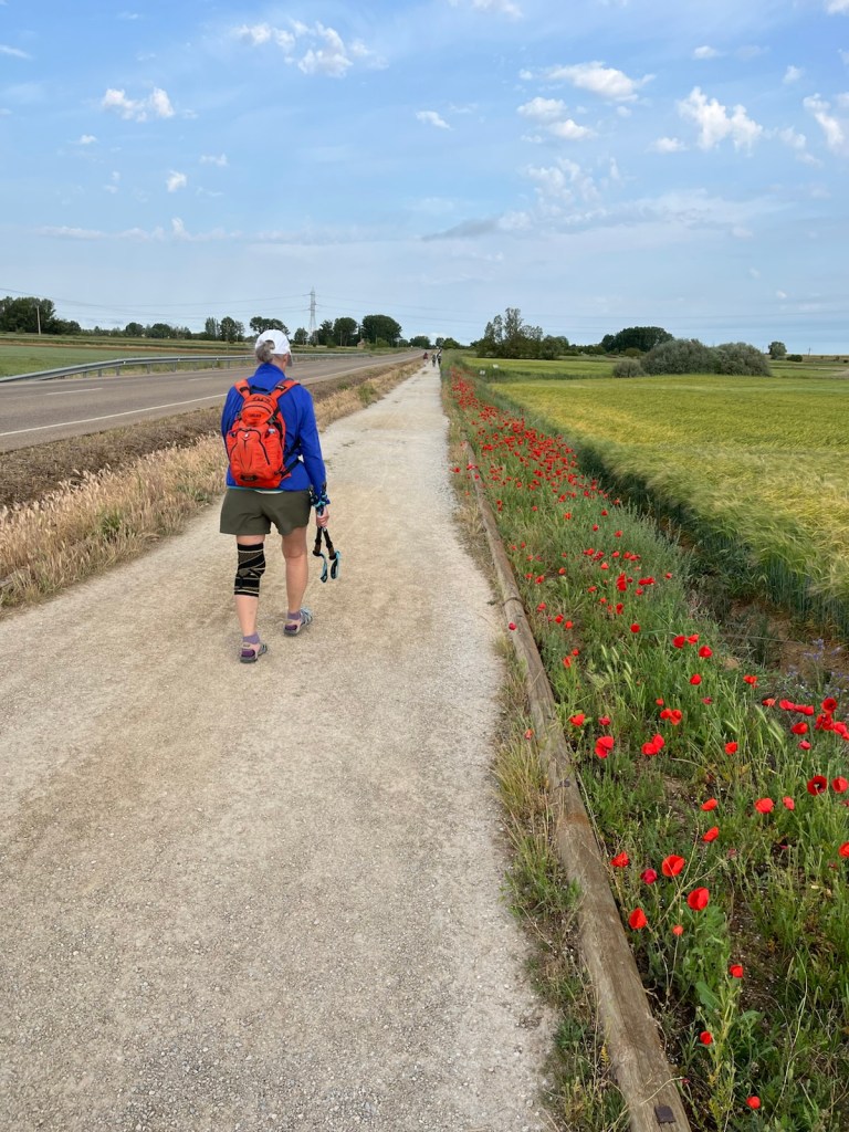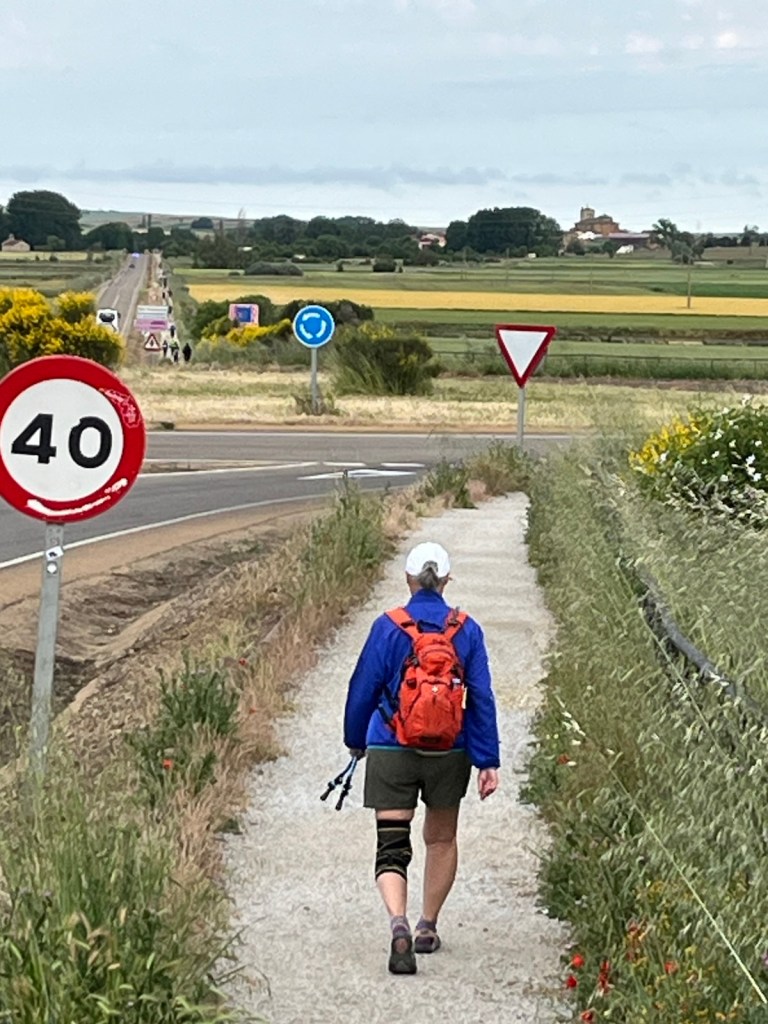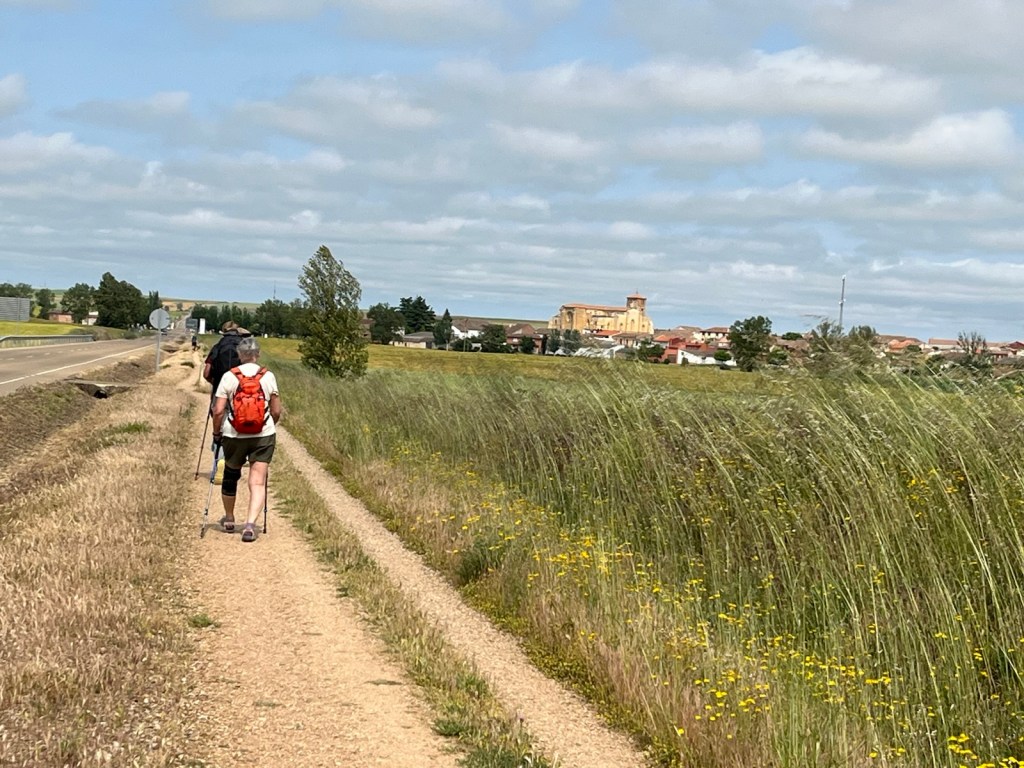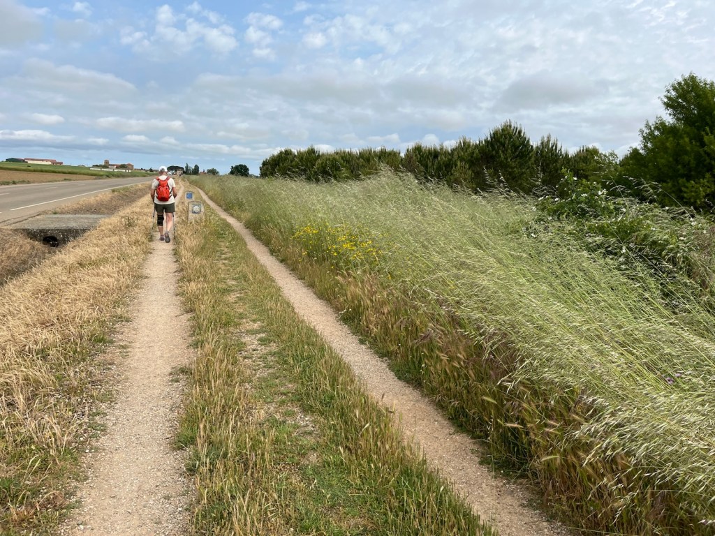 We left Fromista on wide, attractive sidewalks.On the edge of town we were greeted by a pilgrim ironwork as we crossed the autovia and worked our way safely through the traffic circle.Walking off the traffic circle ramp you can see the local straight road on the left with the Camino dirt path running parallel. The church in the right portion of the photo is in Población del Campos, the first stop for the day.The Camino path as we approached Poblacíon de Campos.We stopped at a bar that was open for the first time of all our Caminos. They didn’t have tostadas so Jim ordered the ham, cheese, egg toasted sandwich. Linda saw the toast and asked if they couldn’t just toast two pieces of bread like Jim’s sandwich and add butter and jelly. The owner looked at her and said ok and got to work on her tostadas.We left the Poblacíon de Campos paved streets and rejoined the Camino dirt path.Two miles later, Revenga de Campos became our next stop for Colacao (Spanish hot chocolate). We revisted a nice albergue that had just opened on our last Camino.Linda getting her gear together to move on after our Revenga de Campos stop.Leaving Revenga and rejoining the dirt path, paralleling the local road.As you can see we are still on the Meseta, surrounded by agricultural fields on both sides of the Camino path, only scattered trees and no mountains in the distance.We’ve been amazed by the beautiful wildflowers bordering and sometimes occupying parts of the fields. This is much more prevalent than we have witnessed during prior “summer/fall” Caminos.The Camino looked much the same as we approached Villarmentero de Campos, our last planned stop of today’s longer than usual walk.Amanacer, a primative albergue is the only accommodation with services in Villarmentero de Campos. Today, all was quiet, the bar was locked up tight, but the restroom’s were open. After a brief stop we moved on for the last leg of today’s walk.Beginning the last leg of today’s walk.The road today was long and straight and very similar with the exception of our rests tops in small villages along the way.