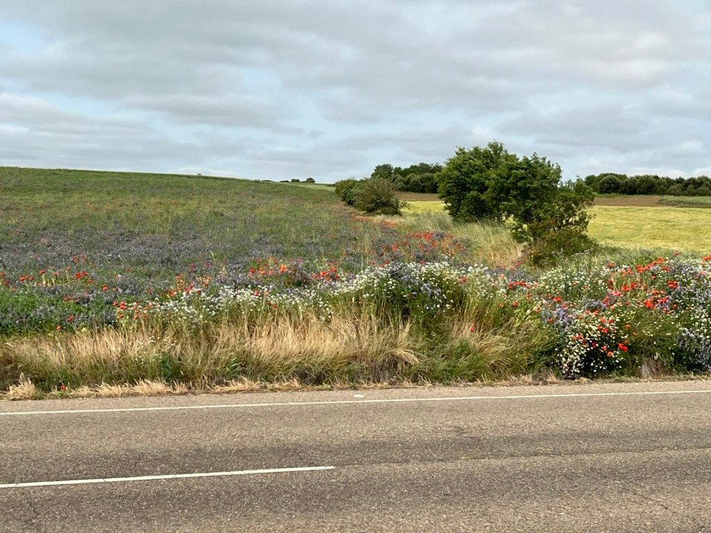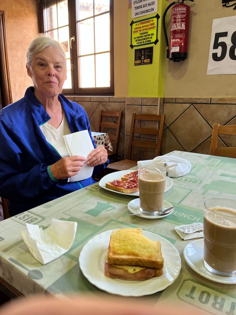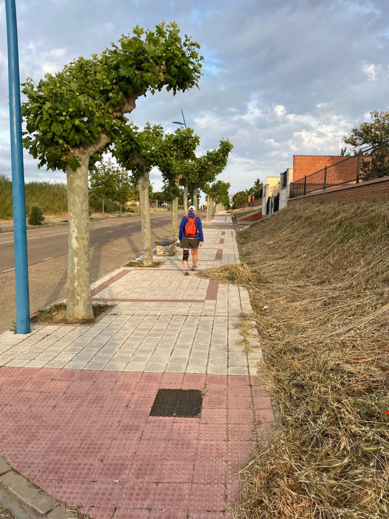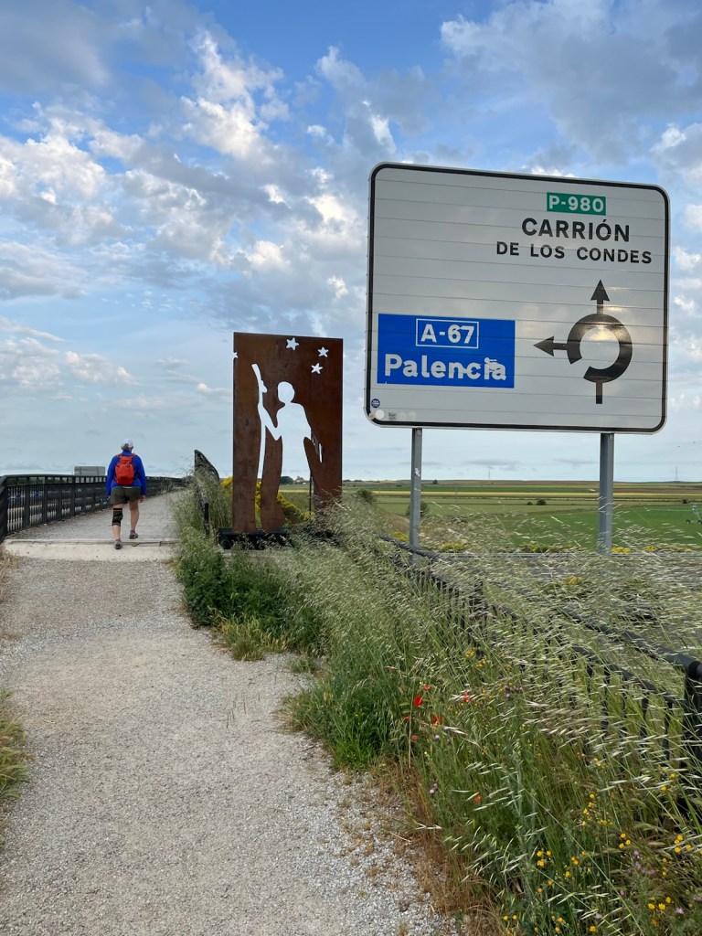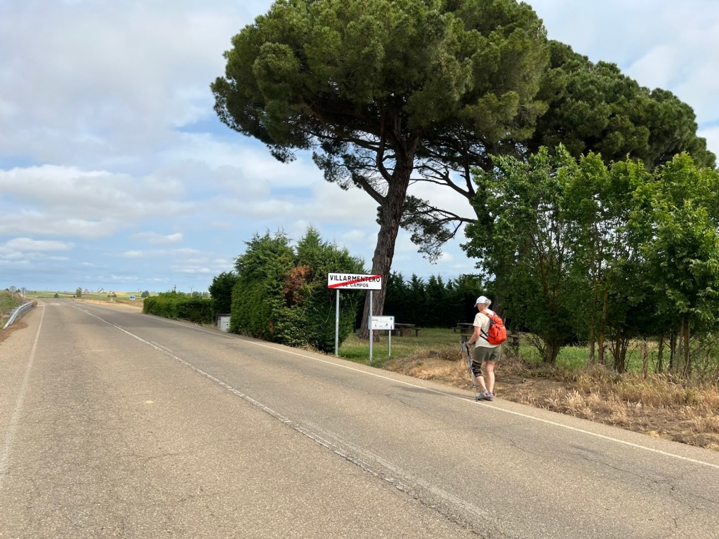 We left Fromista on wide, attractive sidewalks.On the edge of town we were greeted by a pilgrim ironwork as we crossed the autovia and worked our way safely through the traffic circle.Walking off the traffic circle ramp you can see the local straight road on the left with the Camino dirt path running parallel. The church in the right portion of the photo is in Población del Campos, the first stop for the day.The Camino path as we approached Poblacíon de Campos.We stopped at a bar that was open for the first time of all our Caminos. They didn’t have tostadas so Jim ordered the ham, cheese, egg toasted sandwich. Linda saw the toast and asked if they couldn’t just toast two pieces of bread like Jim’s sandwich and add butter and jelly. The owner looked at her and said ok and got to work on her tostadas.We left the Poblacíon de Campos paved streets and rejoined the Camino dirt path.Two miles later, Revenga de Campos became our next stop for Colacao (Spanish hot chocolate). We revisted a nice albergue that had just opened on our last Camino.Linda getting her gear together to move on after our Revenga de Campos stop.Leaving Revenga and rejoining the dirt path, paralleling the local road.As you can see we are still on the Meseta, surrounded by agricultural fields on both sides of the Camino path, only scattered trees and no mountains in the distance.We’ve been amazed by the beautiful wildflowers bordering and sometimes occupying parts of the fields. This is much more prevalent than we have witnessed during prior “summer/fall” Caminos.The Camino looked much the same as we approached Villarmentero de Campos, our last planned stop of today’s longer than usual walk.Amanacer, a primative albergue is the only accommodation with services in Villarmentero de Campos. Today, all was quiet, the bar was locked up tight, but the restroom’s were open. After a brief stop we moved on for the last leg of today’s walk.Beginning the last leg of today’s walk.The road today was long and straight and very similar with the exception of our rests tops in small villages along the way.