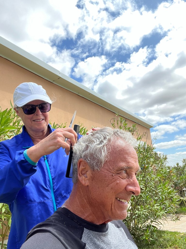 Unlike most pilgrims, Jim brought along his personal barber and took advantage of our knowledge of the La Perala layout. He set up an outdoor chair in the warm sun, inconspicuous to other pilgrims, who might form a line and tie up Linda’s afternoon.