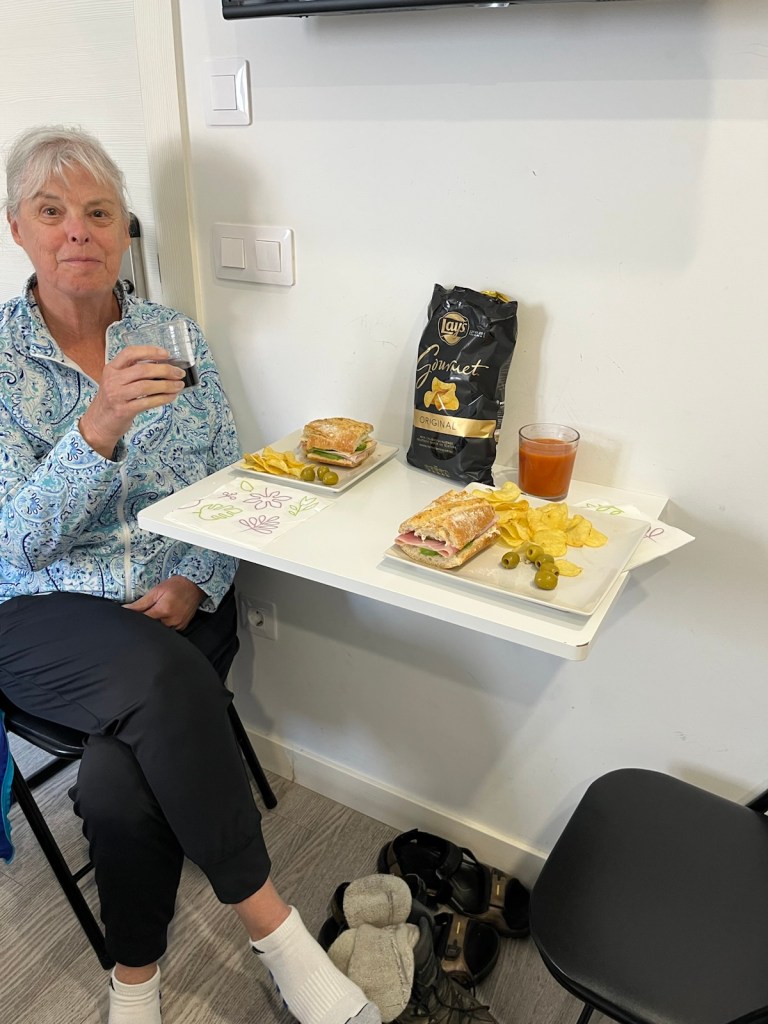 The result of our market visit was a tasty lunch of: “Gourmet” potato chips, Spanish olives. and a fresh warm bread sandwich of ham, Gouda cheese and sliced avocado. We both had glasses of our Mencia wine and Jim also had a glass of gazpacho. Yum.
