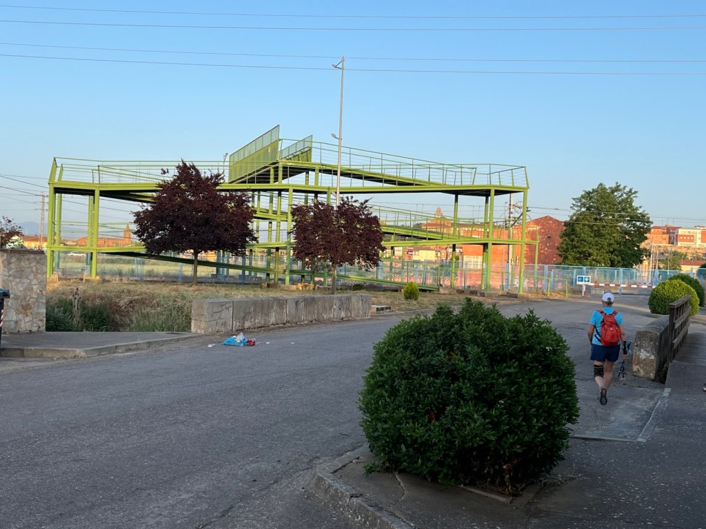 Up ahead is structure for pilgrims and others to get safely over the train tracks.