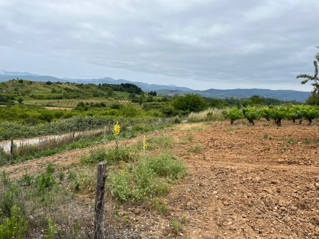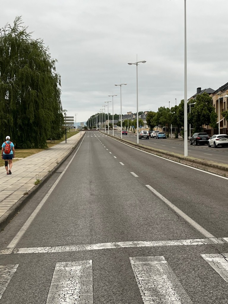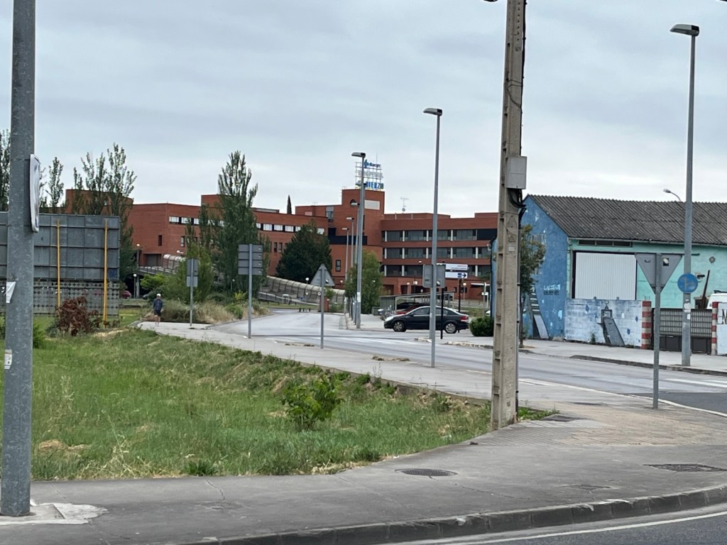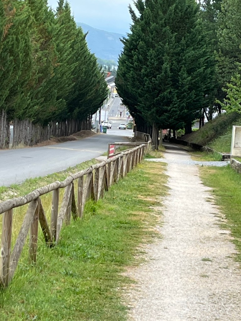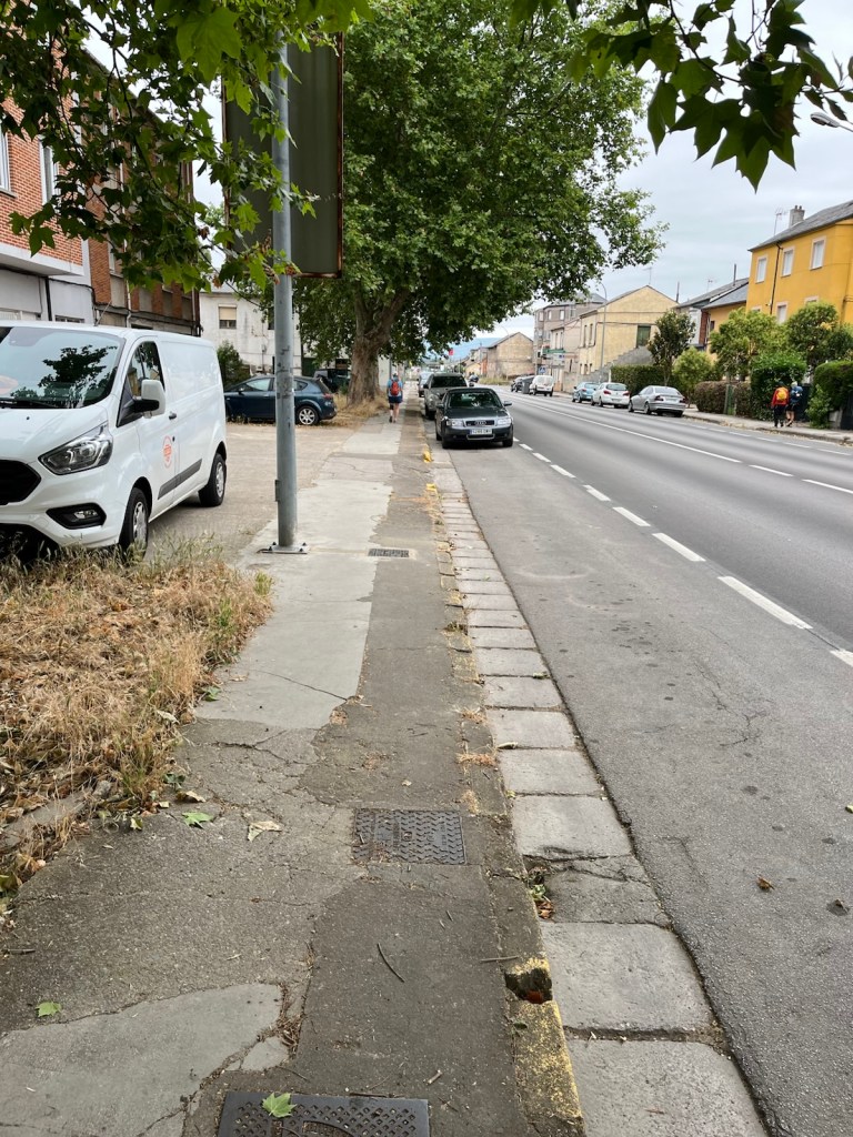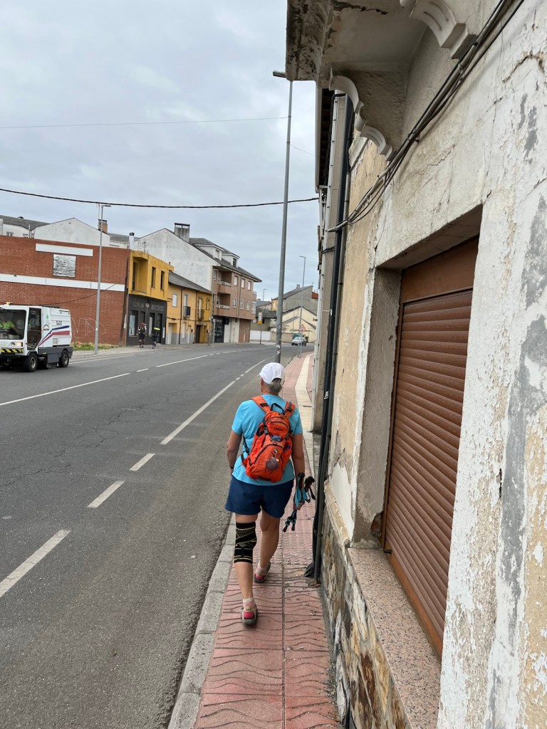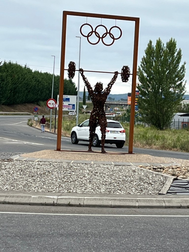 Our hotel was in the midst of an upscale residential area of Ponferrada, so we needed to walk a few blocks to join the Camino.The Camino has two routes through Ponferrada. We chose the one which is a straight line from our hotel to Camponaraya. The other route takes a less direct route north of the city, through a rather run-down area with little or no services and not very interesting scenery. We have chosen the more direct route since 2019 including today.Upscale houses and modern office buildings and residences.Less modern housing and buildings as we walked away from the city center.We stopped after two miles for breakfast.A nice breakfast for 6.40€.Sidewalks were not as nice as we got further from Ponferrada.An interesting front yard as we moved into the Bierzo region.A major hospital serving the Bierzo region.The sidewalks got kinda narrow as we walked into Companaraya.Jim’s favorite hardware store on the Camino with beautiful wall mural.Tribute to Lydia Valentin, Olympic Gold medal, Women’s Heavyweight Weightlifting, 2012 Summer Olympics, from Companaraya, Spain.Leaving Companaraya, looking back at Lydia Valintin statue.Crossing the Auto Via into Ponferrada and heading into the Bierzo region. Back on the dirt path of the Camino and heading into the vineyards.The vineyards of Bierzo, and the home of Mencía and Godello grapes.Healthy looking vineyards, with only tiny beginnings of grapes forming on very old plants.Grapes normally mature in August for harvesting.