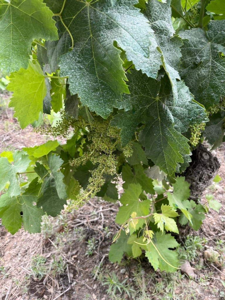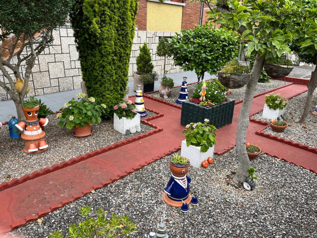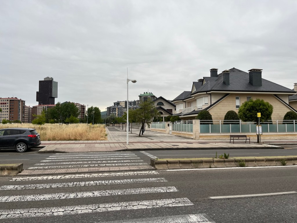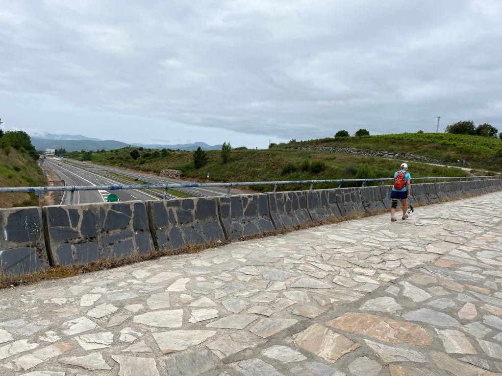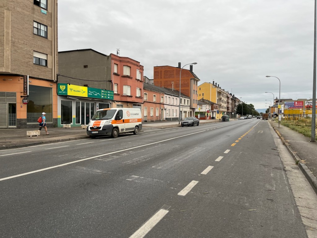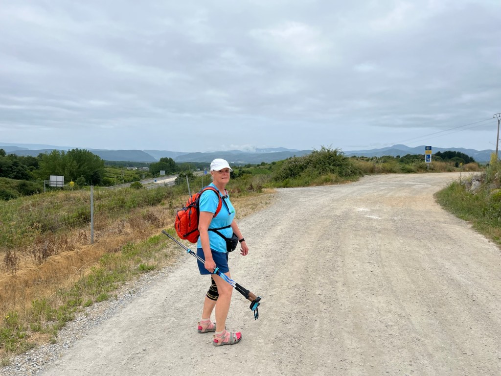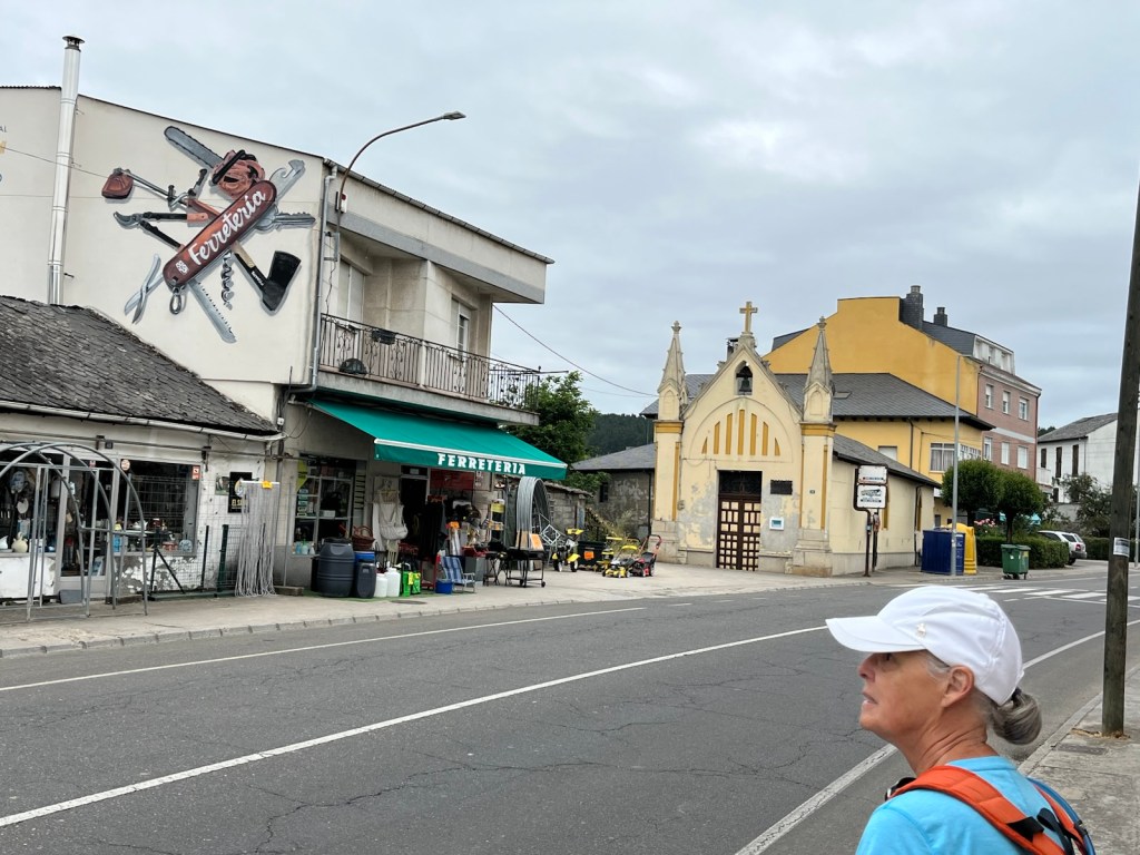 Our hotel was in the midst of an upscale residential area of Ponferrada, so we needed to walk a few blocks to join the Camino.The Camino has two routes through Ponferrada. We chose the one which is a straight line from our hotel to Camponaraya. The other route takes a less direct route north of the city, through a rather run-down area with little or no services and not very interesting scenery. We have chosen the more direct route since 2019 including today.Upscale houses and modern office buildings and residences.Less modern housing and buildings as we walked away from the city center.We stopped after two miles for breakfast.A nice breakfast for 6.40€.Sidewalks were not as nice as we got further from Ponferrada.An interesting front yard as we moved into the Bierzo region.A major hospital serving the Bierzo region.The sidewalks got kinda narrow as we walked into Companaraya.Jim’s favorite hardware store on the Camino with beautiful wall mural.Tribute to Lydia Valentin, Olympic Gold medal, Women’s Heavyweight Weightlifting, 2012 Summer Olympics, from Companaraya, Spain.Leaving Companaraya, looking back at Lydia Valintin statue.Crossing the Auto Via into Ponferrada and heading into the Bierzo region. Back on the dirt path of the Camino and heading into the vineyards.The vineyards of Bierzo, and the home of Mencía and Godello grapes.Healthy looking vineyards, with only tiny beginnings of grapes forming on very old plants.Grapes normally mature in August for harvesting.