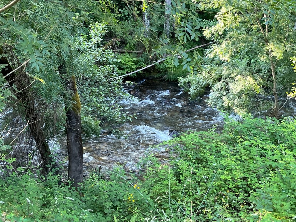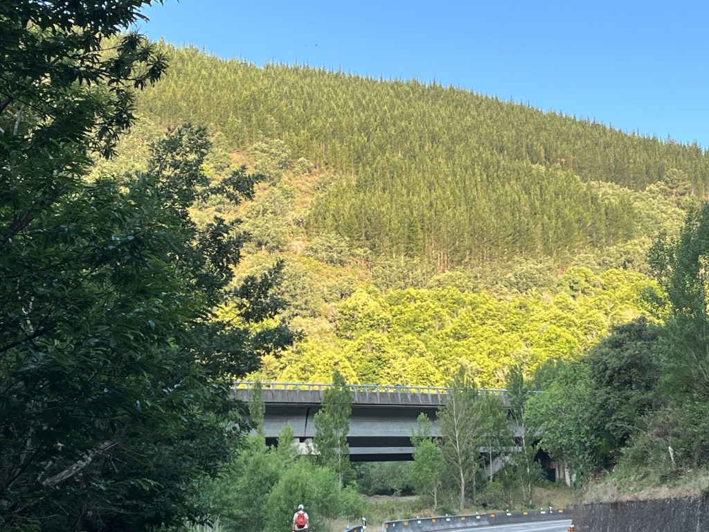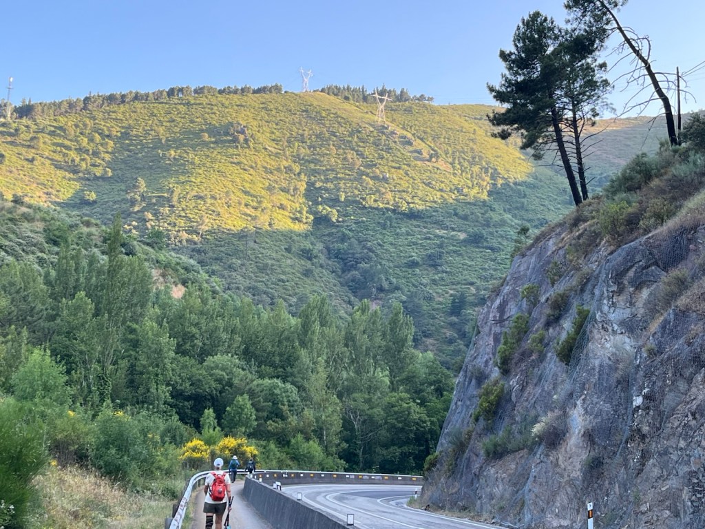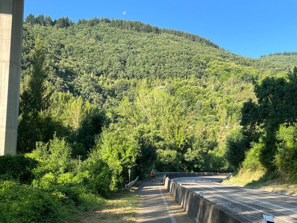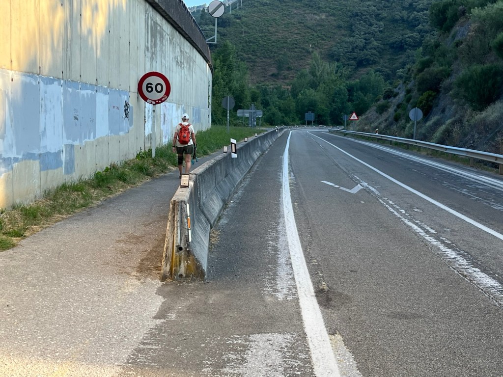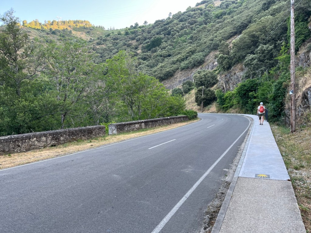 No tourists, locals or pilgrims in the Plaza Mayor when we left El Campano and walked through old Villafranca del Bierzo at 7:30 this morning.We finally passed a pilgrim going slower than us as we crossed the Rio Buria.Looking back on Villafranca and the Rio Burbia.Walking by the Rio Valcarce as we left Villafranca and began the walk through the mountain pass.Old section and new section (added in 2024) to make Camino safer for pilgrims for the 1 mile section from here to the motor vehicle barrier section of paved walkway to Trabadelo.This is what it looked like as we walked along the motor vehicle barrier to Trabadelo (~5 miles).