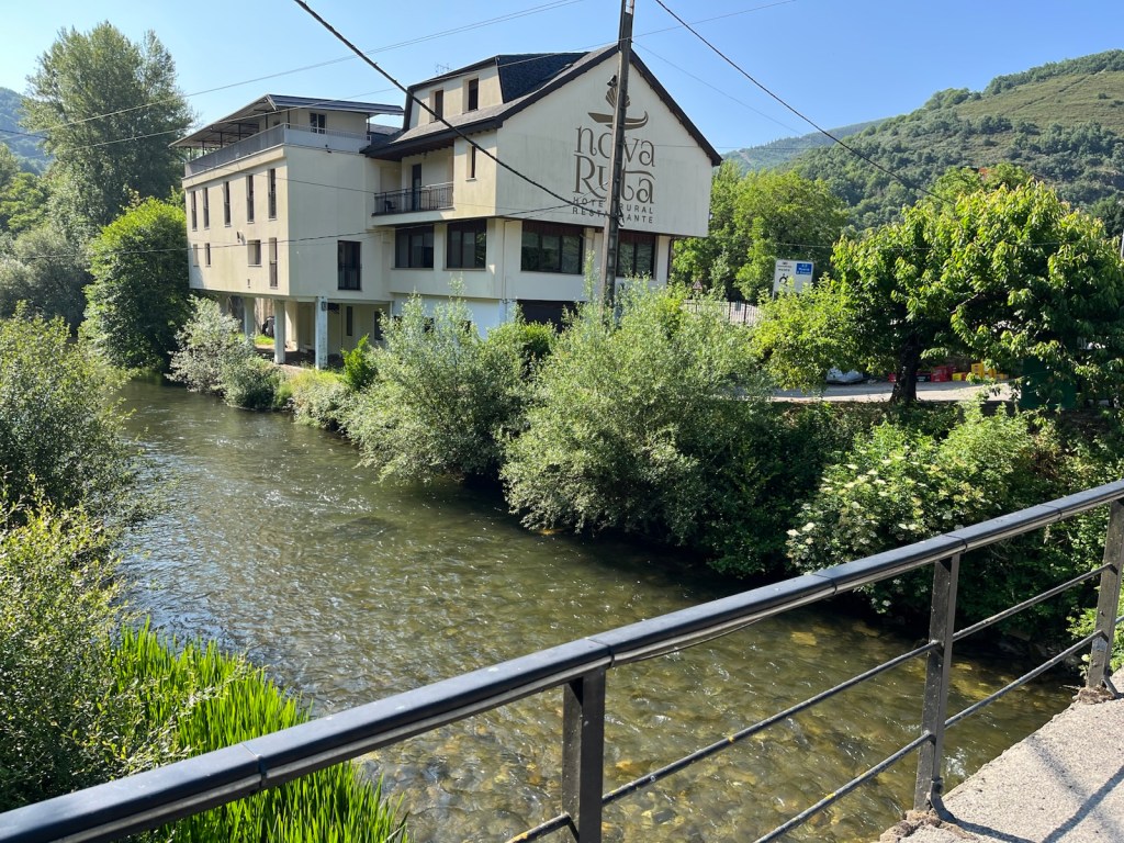 Las Coronas in Pereje – bar/restrooms on right, terrace service across the streetNew interior of Bar Las Coronas in PerejeRio Valcarce and bridge just past PerejeVery old chestnut trees along the walk into Trabadelo.Our Hostal in Trabdelo: Novaruta