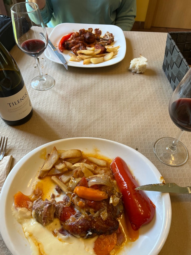 Ensalada rusa for Linda, Garbanzo stew for Jim. Paired with an excellent Bierzo/Mencía wine.Roasted marinated chicken for Linda, Braised pork knuckles for Jim.