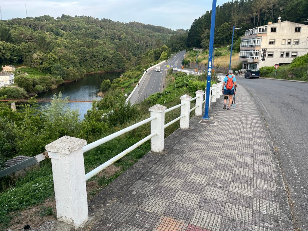 Walking from Portomarin down to cross the bridge and join the Camino.