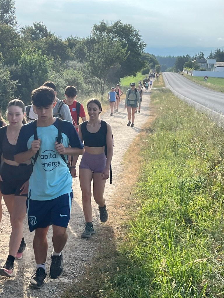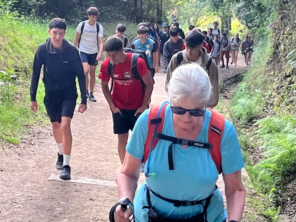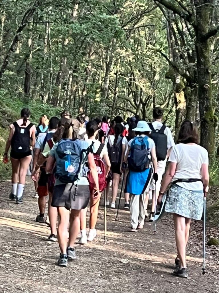 Soon after beginning to climb the mountain going out of Portomarín a large wave of young pilgrims appeared behind us.
