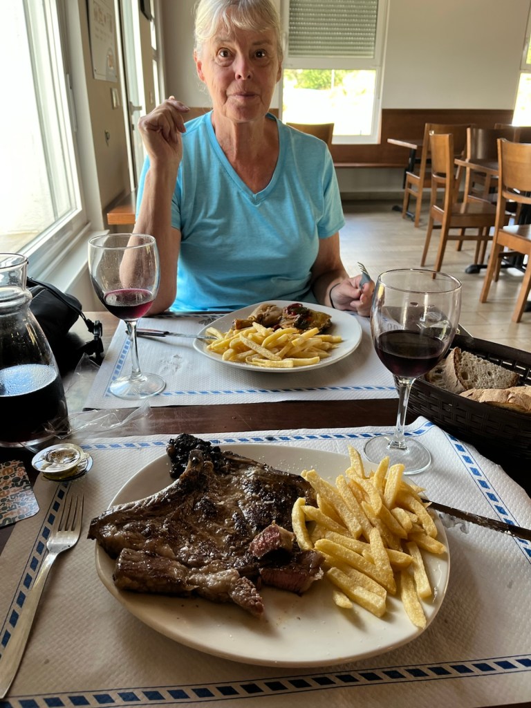 Ensalada mixtas for both of us, chicken for Linda and tender beef steak for Jim with house wine (Mencía) and cheesecake for dessert.