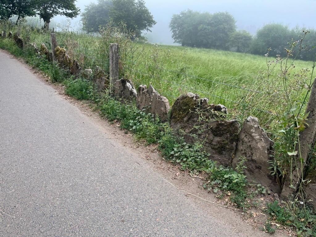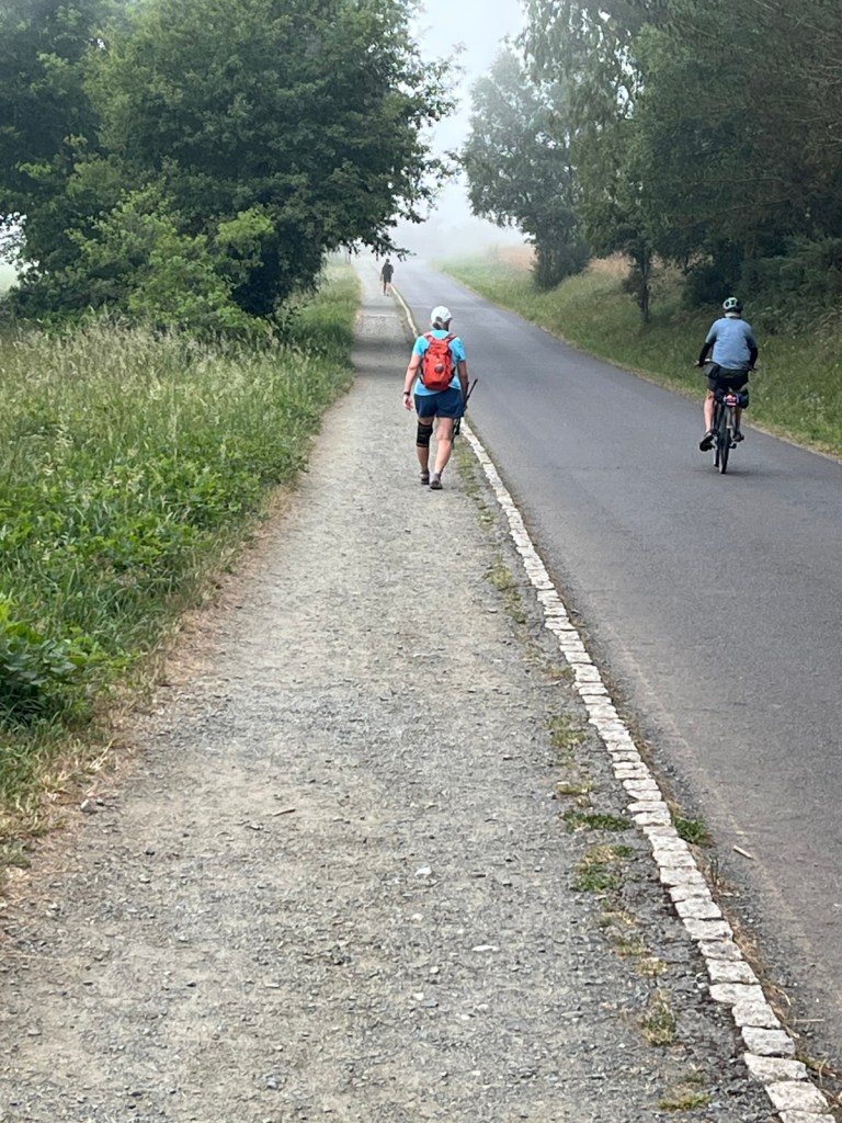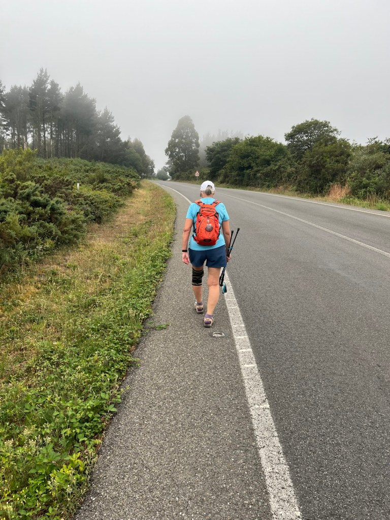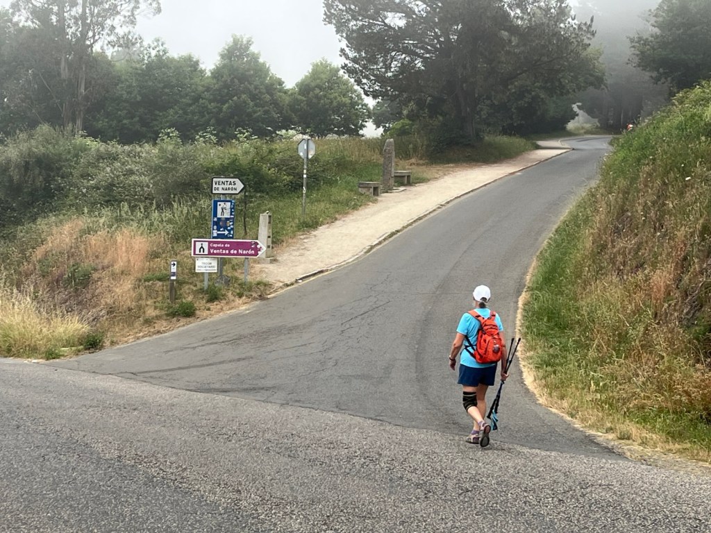 Leaving Gonzar this morning, it was 59F and foggy.The traditional Camino path heads off to the left through several small hamlets without services and many abandoned buildings and ruins. The road to the right is lightly traveled, has a good shoulder and smoother walking surface. We have opted for the option on the right since 2022.This was the typical look as we walked along the road for about 2 miles.The two options merged at this traffic circle and an albergue in the background.Immediately after the circle and inspite of poor signage, we took this small paved road leading to Ventas de Narón.The dirt path and the paved road were about the same width and gave us a choice of walking surfaces, as the traffic was quite low.