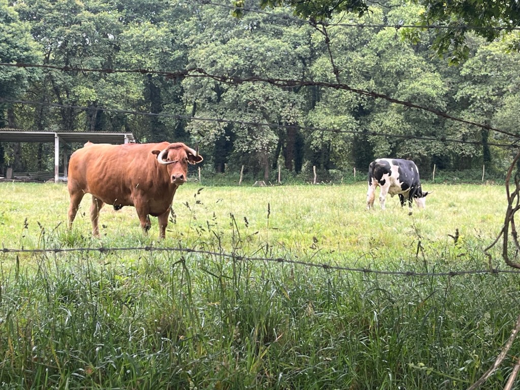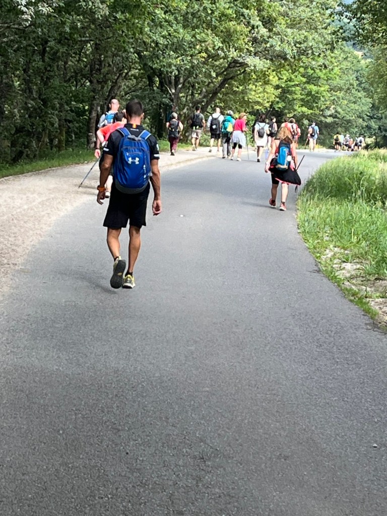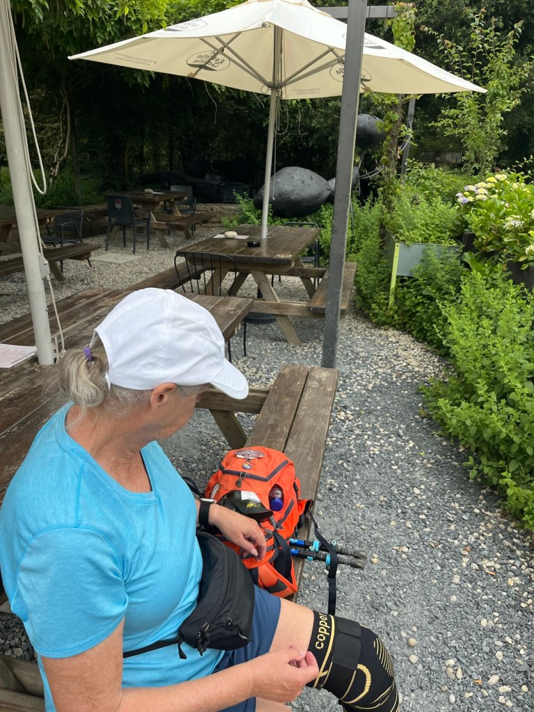 The path and road continued through mostly pastures and occasional corn fields and potato fields.We stopped for some OJ and a brief rest stop at this relatively new bar in Prebista.Nice set of horns on these two bulls just before LameirosWe made another brief rest stop in Ligonde. The house above has intrigued Jim. On all 7 Caminos, including today, this house in Ligonde has always had some type of decoration of pumpkins, gourds, tomatoes and other fruits and vegetables placed along the railing. She can often be seen in her kitchen window looking out at pilgrims and occasionally waving or otherwise acknowledging us as we pass by. She waved in answer to Jim’s wave today.This field is at the exit of Ligonde and frequently contains ducks, chickens, goats and other critters. On the opposite edge of this field is a rocky, narrow path/wash designated as the Camino. After walking it on our first Camino in 2015, we have taken the road that merges with it at the bottom of the hill, as we did today. No harm, no foul.We have ignored talking about the continuing onslaught of young pilgrim groups on the Camino today. Nevertheless, here’s an example of how they can monopolize a stopping point or services also sought by individual pilgrims.The Camino was also busy most of the way on today’s walk, but with a greater balance between groups and individuals, and did not seem nearly as intrusive as yesterday.As Linda waited for the taxi at A Paso de Formiga, she had no fear of the giant insect sculptures just a few feet from her bench, now hiding in the overgrowth of the bar’s outdoor seating.
