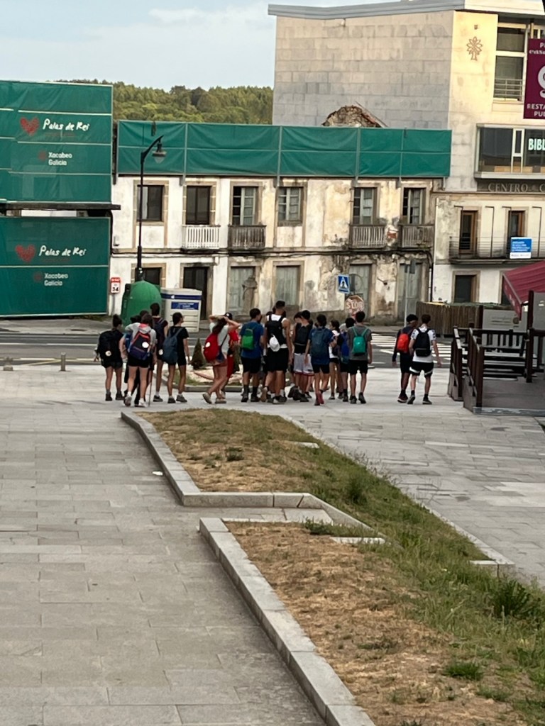 A group of pilgrims leaving a nearby Palas de Rei albergue and beginning their walk for the day… probably to Melide.