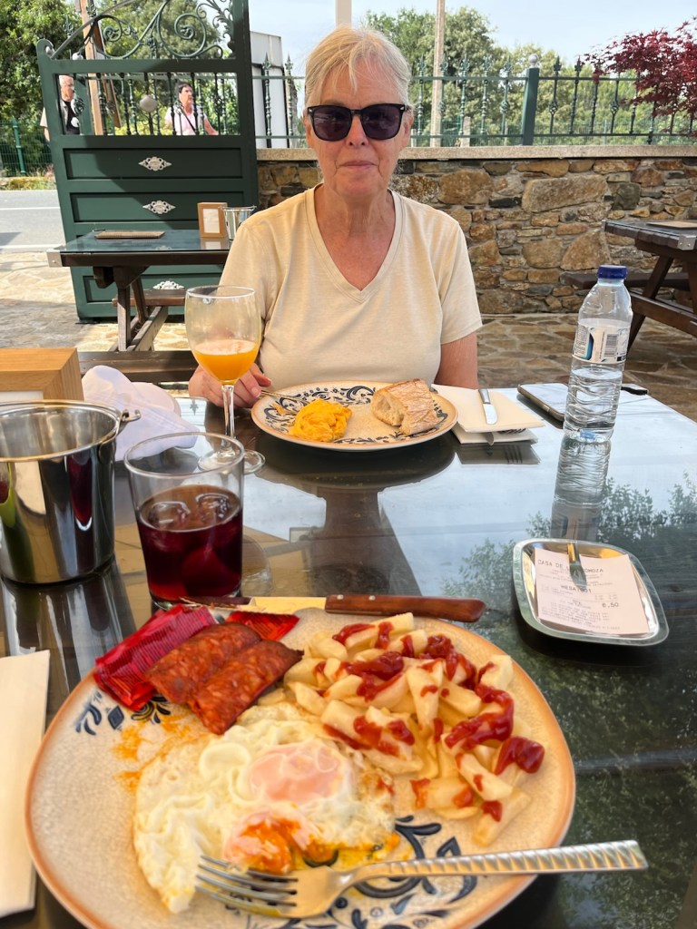 We were satisfied with our walking challenge for the day when we arrived at O Coto, just a tad over 3 miles from Melide. We stopped to recharge our batteries with an omelette for Linda and eggs, fries and chorizo for Jim.