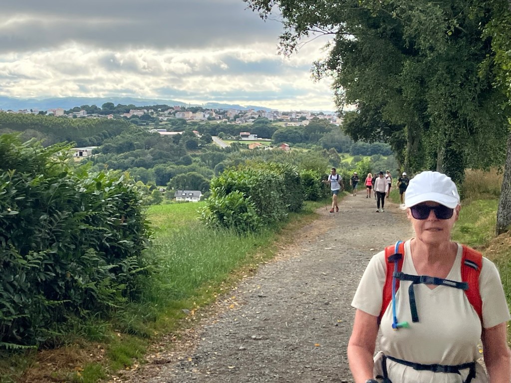 More pilgrims coming up behind us with Arzúa in the background.