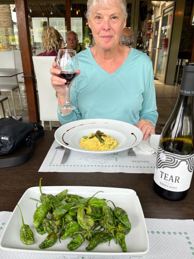 For lunch Jim had Padron peppers. Only one pepper was hot and the other 30 were not, keeping with the trend that Spain’s Padron Peppers are losing their heat, but these still had the delicious unique flavor. Linda had her favorite: scrambled eggs, with asparagus and apple. We shared a tasty beef entrecôte with salad. The Mencía wine was another winner and we saved half the bottle for dinner.