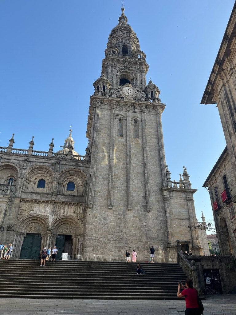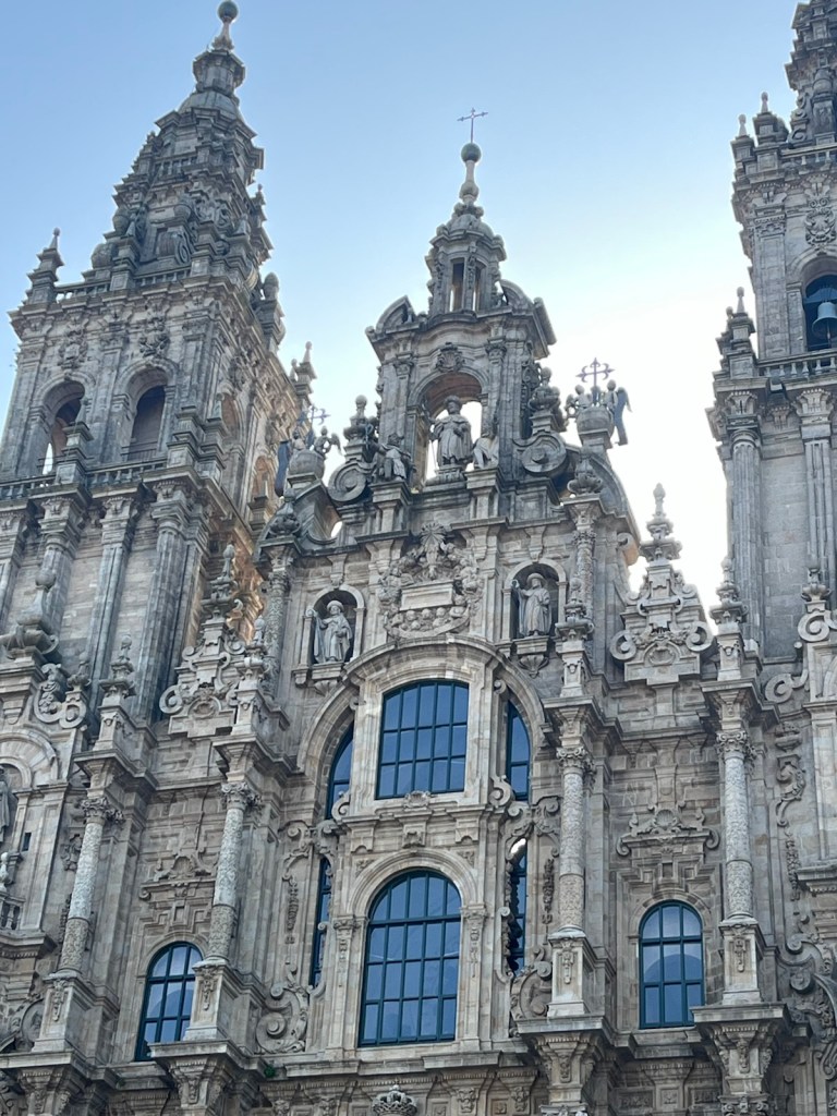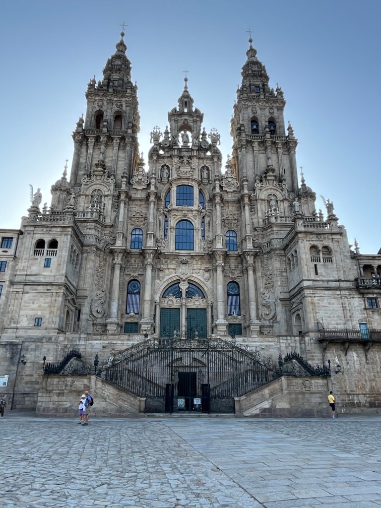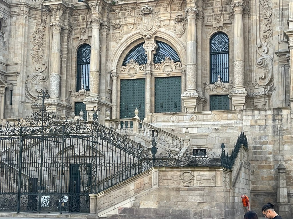 A view of the Catedral looking directly at the Pórtico de la Gloria (gated door on center, ground level). The Pórtico of Gloria was like a porch where pilgrims entered the 24/7 over 1000 years ago. It was closed this morning so will have to check it out next trip!