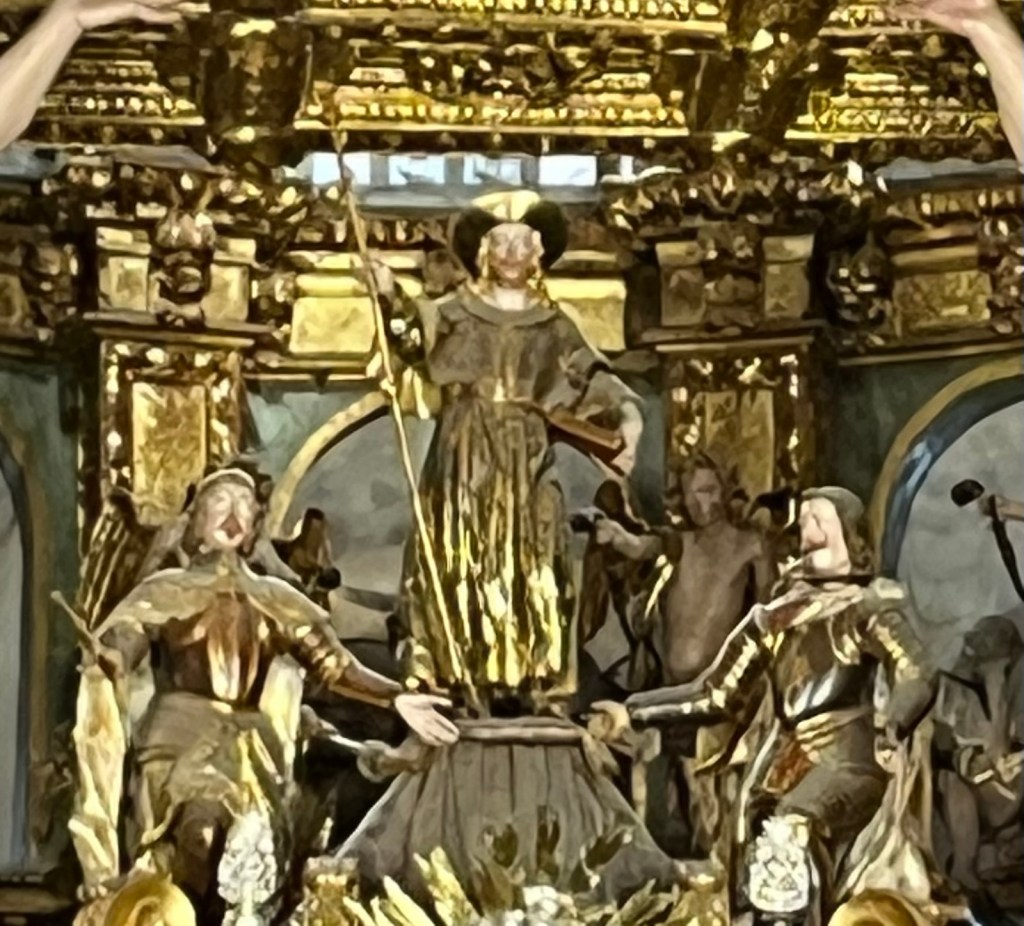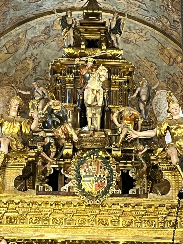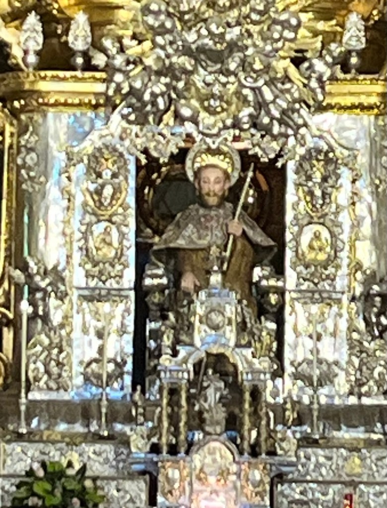 A closer look at Santiago, the Apostle. This depiction of St. James is the main focus of the Altar Major and is positioned just above the crypt that holds the remains of St James and two of his followers. Pilgrims can climb the steps behind him and embrace him, by placing their arms around his shoulders.